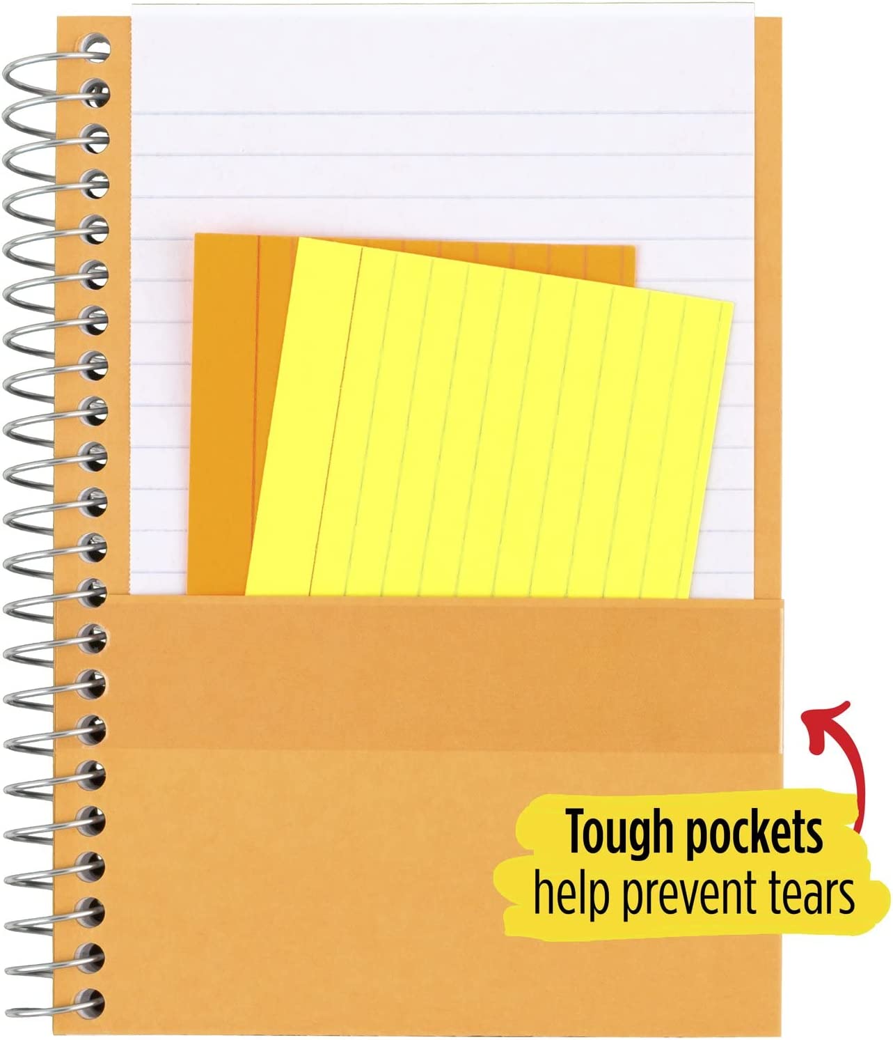 • Tough pockets help prevent tears and hold 4-3/8" x 7" loose sheets and notes. Water resistant covers protect your notes and our Spiral Lock wire helps prevent snags on clothes and backpacks.