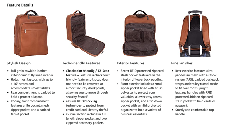 • fine finishes: classy, full grain Colombian leather exterior with a tear-resistant, fully lined tear-resistant interior. Rear exterior features an ultra-padded air mesh with air Flow system (afs) and padded backpack straps for ultimate comfort while on the move. Sturdy and comfortable top handle for easy carrying. Rear features a trolley tunnel made to fit over most upright trolley handles for hands-free carrying.