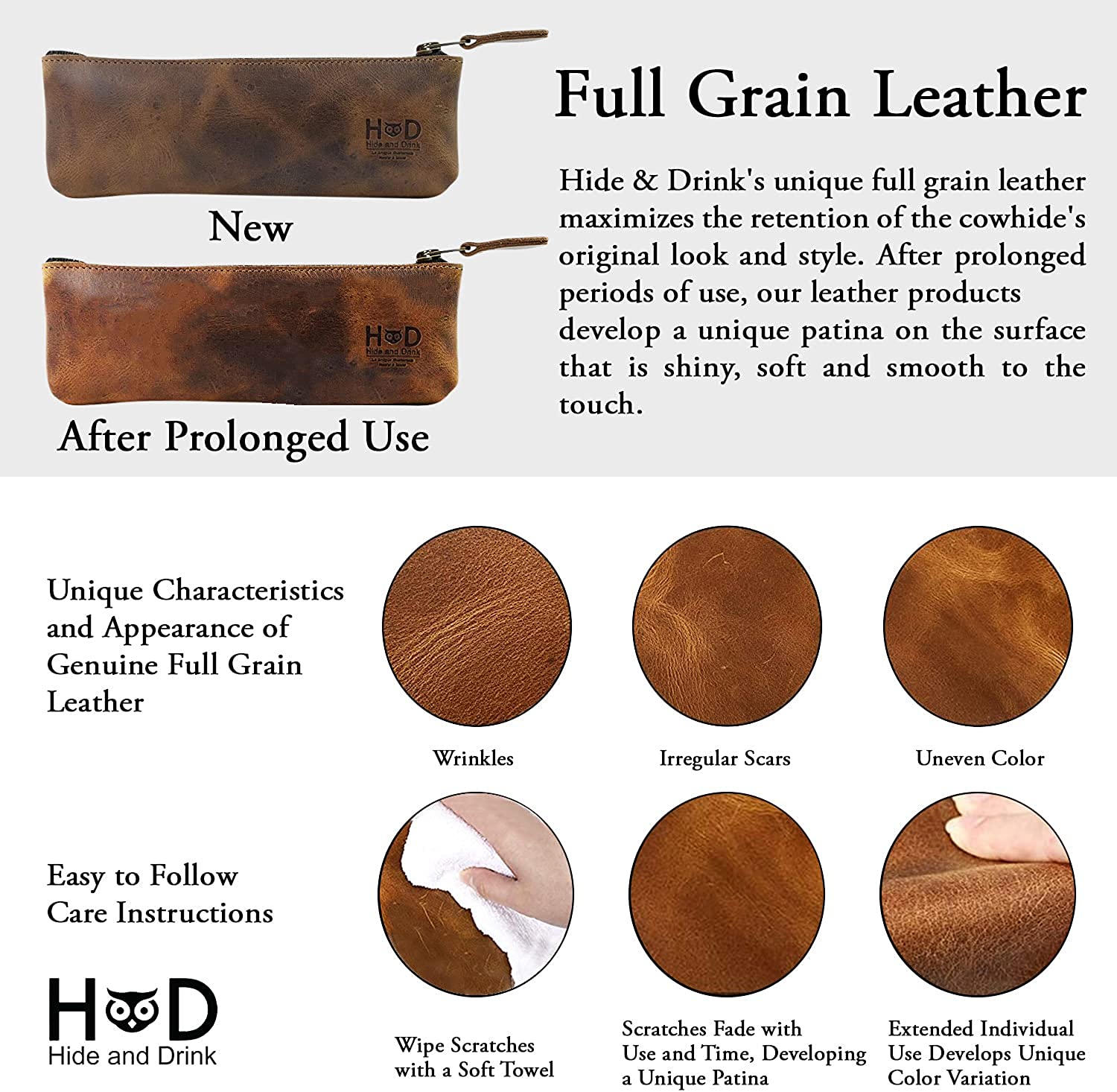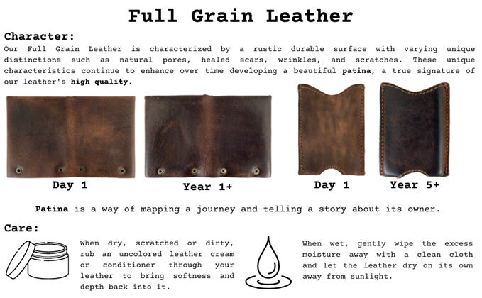 All Hide & Drink leather products are handmade from rustic, durable, Full Grain Leather. Our Full Grain Leather comes from the top layer of the hide, and has all the natural full grain characteristics of the hide...hence the name. It's the best leather you can buy and the only leather that we use. The flesh side of the soft leather is first stained with natural drab tone and finished with our proprietary beeswax conditioner. Our unique treatment helps the leather to retain its shape without the aid of synthetic stabilizers, offering a natural and durable look.