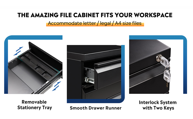 • 【INTERLOCK SYSTEM】One lock with 2 keys secures all 3 drawers, two stationery drawers with a bonus pencil tray and one file drawer, add security to your home and office
