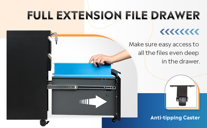 • 【ADD MORE MOBILITY】This mobile file cabinet arrives with five casters, including two front casters with braking function and one center caster to prevent tipping