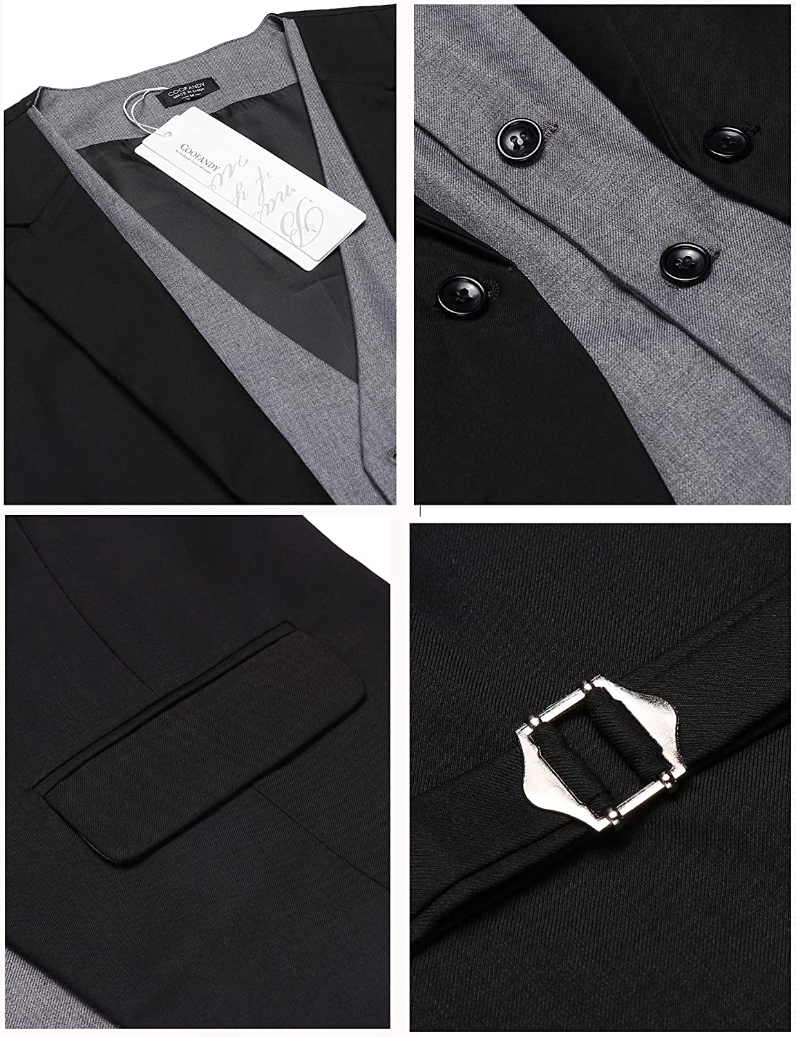 - STYLISH DESIGN - Men's layered dress waistcoat is designed to doulble layer, adjustable back strap, V-neck, sleeveless, 4 buttons, classic single breasted. Easily stands out from usual suit coat yet looks very handsome.