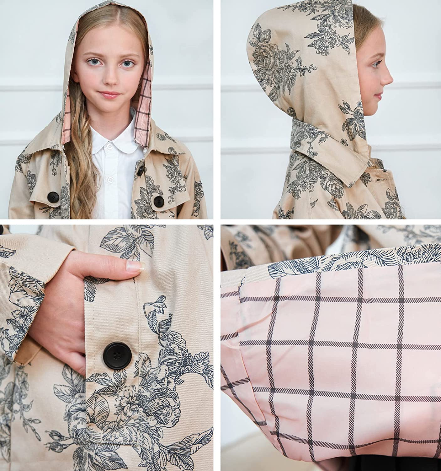 Casual trench coat came with classic plaids lining and you can roll up sleeves for a fashionable look; Detachable hood fastened by buttons