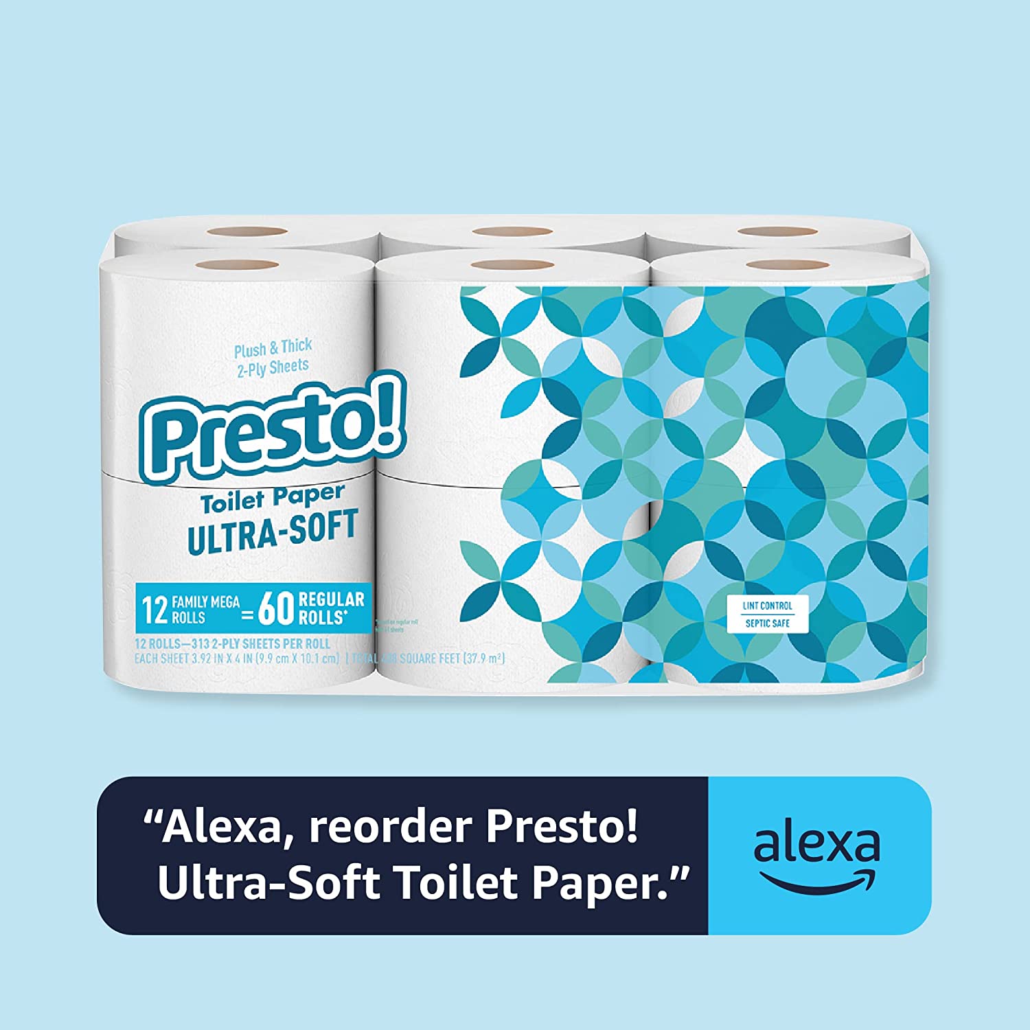 Running low? Restock by asking, “Alexa, order Presto! ultra-soft toilet paper” through your Alexa device