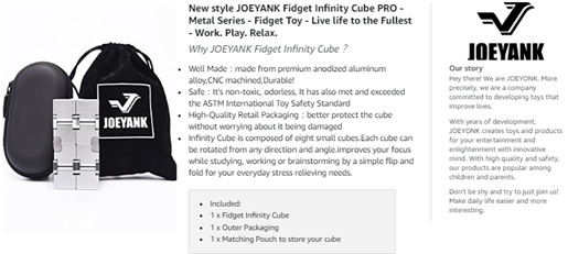 All JOEYANK Fidget Spinners purchased from the only verified seller JOEYANK are provided. We want to that you are happy with your JOEYANK Fidget Infinity cube and so you can purchase with confidence from JOEYANK.