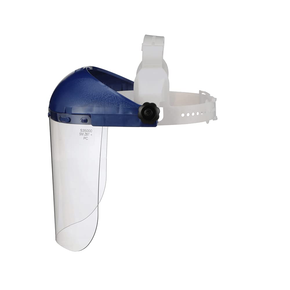 The Sellstrom Single Crown Face Shield comes assembled with a pin lock suspension headgear that attaches to the user’s head with a locking mechanism. The convenient, protective system gives you the flexibility and safety to handle various types of grinding, brazing, and cutting operations. The scratch resistant window constructed with polycarbonate material provides wraparound protection and curves naturally to fit facial contours, and ensures reliable protection from splashes, particles, and flying debris. This extra-large, high-impact, blue plastic, single crown shield provides excellent above-the-head coverage, allows for increased air circulation, and offers exceptional panoramic views. Our safety face shield with ratchet headgear is proudly made in the USA and meets ANSI Z87.1+ and CSA Z94.3 standards. Replacement parts are available for lower cost than having to re-purchase a complete unit.