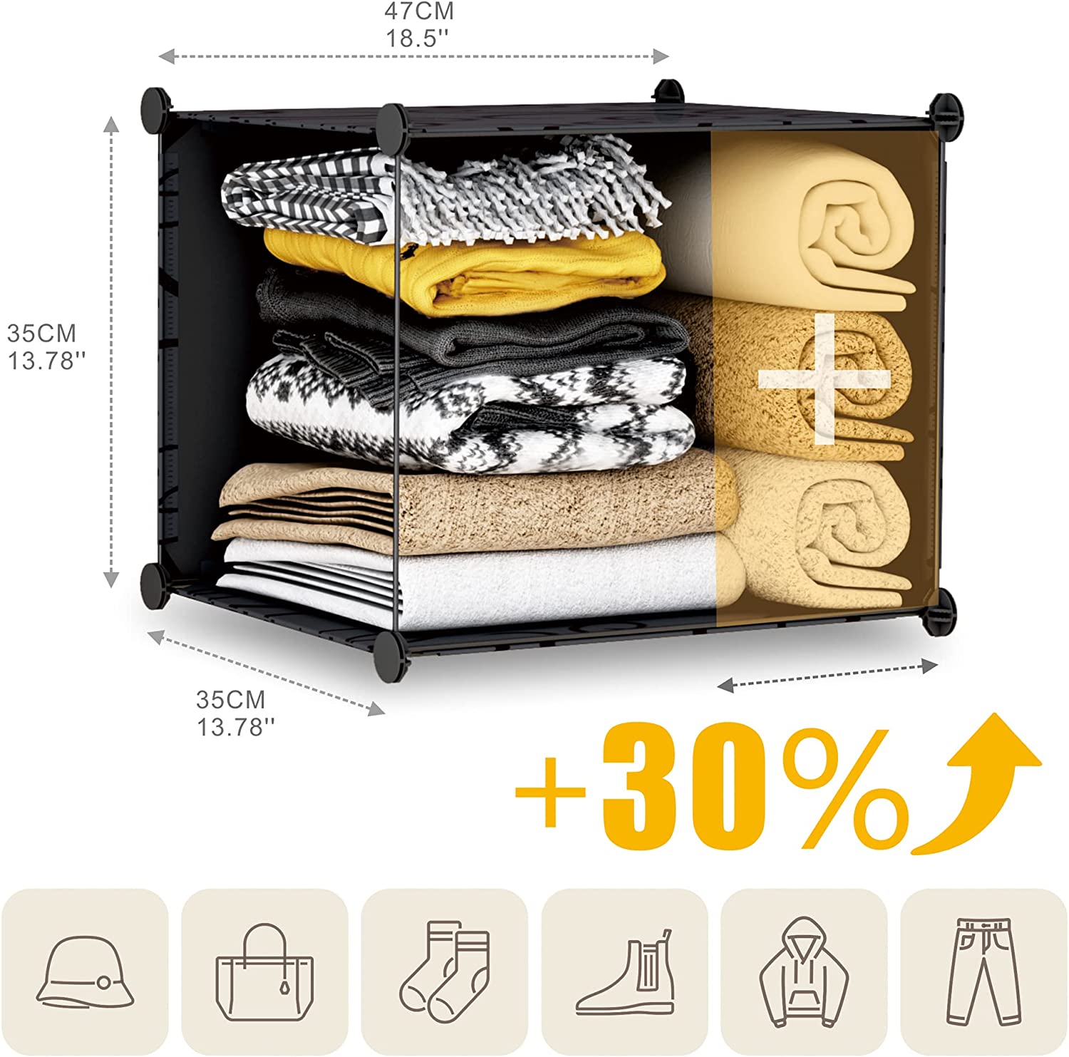 【Large Storage Performance】The size of each cube is 13.78 (length) * 13.78 (depth) * 18.5 (height) (inches), and one cube can hold up to 22 pounds. We also provide hanging clothes rail, it can provide you with enough storage space to keep things tidy.