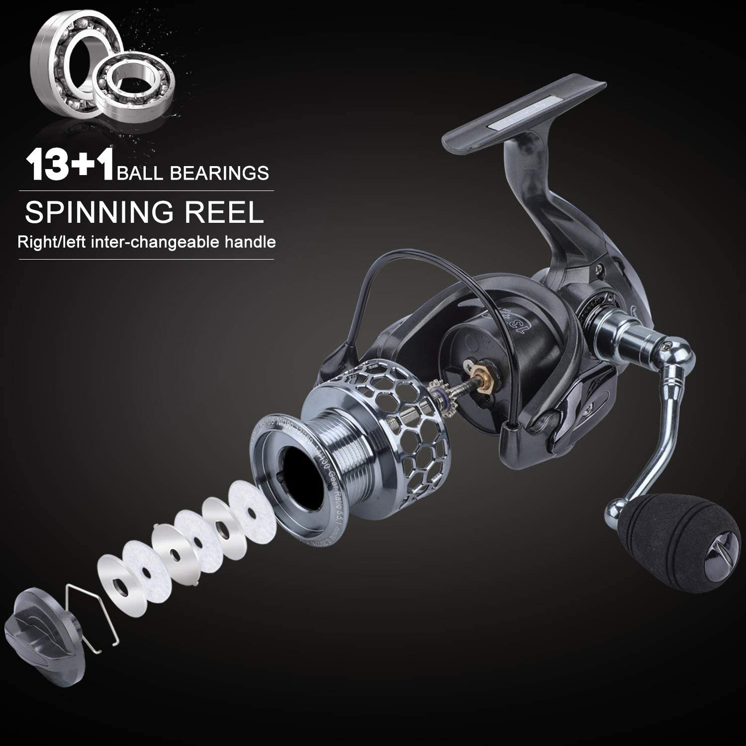 • THE REEL:This Reel Has 13 + 1 Corrosion Resistant Smooth Ball Bearings, Precision Matched Gears and a Powerful 5.5:1 Gear Ratio.Give It Ultra-Smooth Performance.Interchangeable Right or Left Hand CNC Machined Aluminum Handle and Comes with an Extra Exquisite Aluminum Spool.Amazing Aerospace-Grade Aluminum Honeycomb Design Spool Gives You Strength and Light Weight. EVA Knob Makes It Non-Slip and More Comfortable When Long Time Fishing.Model: XY2000.