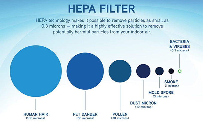 HEPA stands for High Efficiency Particulate Air, and is one of today's top trusted air purification technologies. Through tightly woven material, it captures airborne particulates as small as 0.3 microns in size, such as dust mites, debris, mold spores, pollens and pet dander. Particles that can trigger asthma or allergies typically range from 1.0–10.0 microns in size, and pesky bacteria particles around 0.3 microns in size. HEPA technology makes it possible to remove particles as small as 0.3 microns — making it a highly effective solution to remove potentially harmful particles from your indoor air.. True HEPA filters are highly effective to address your clean-air concerns. We recommend it as the most effective solution to protect you against dangerous airborne particles.