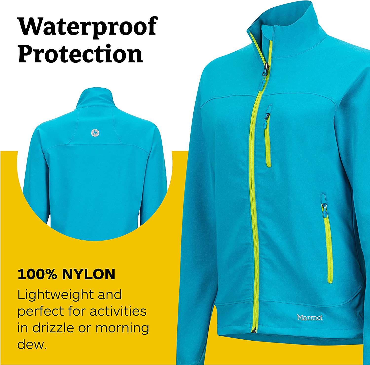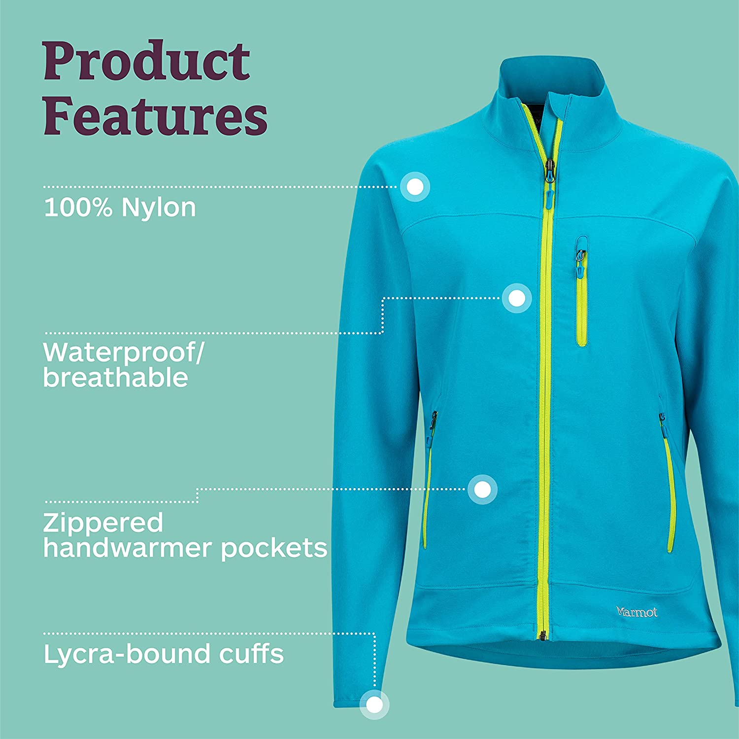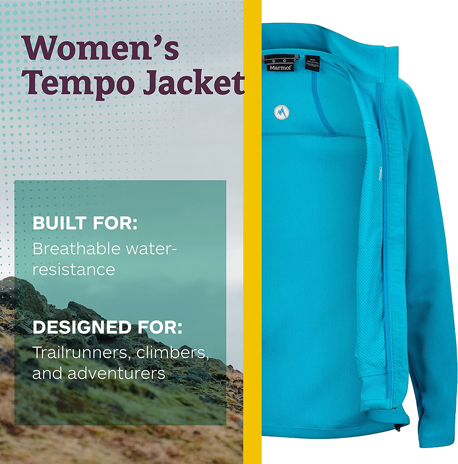 The comfy and water-repellent Tempo women's jacket is a terrific solution for hiking, running, climbing, or simply spending a day around town. Along with the other pieces in marmot's M3 softshell collection, the Tempo is designed for optimal breathability during high aerobic activity in dry, mild climates. Its elastic-bound cuffs and draw cord hem help the garment hug your body while you're on the move, its zippered hand warmer pockets keep your fingers toasty, and its chest pocket sports a headphone port that lets you listen to music without tangled wires in your way. Your arms will retain full mobility through it all, thanks to the built-in angel-wing movement., Fabric: Softshell Double Weave 90% Polyester- 10% Elastane Stretch 7.0 ounce.