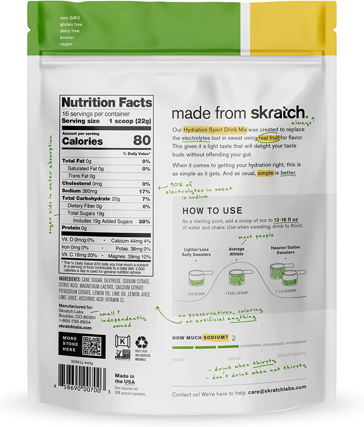 Skratch Labs Hydration Powder | Sport Drink Mix | Electrolytes Powder for Exercise, Endurance, and Performance | Lemon + Lime | 20 Servings | Non-GMO, Vegan, Kosher
