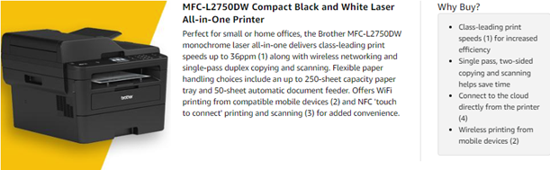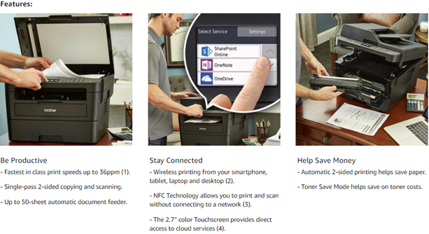 Updated to improve office efficiency for the small or home office, the new Brother Compact Laser All in One includes multiple features to streamline the office experience. The up to 50 sheet automatic document feeder helps you save time with single pass duplex (two sided) copying and scanning. The MFC L2750DW also features multi page copying, scanning, and faxing. It leads the class by delivering lightning quick printing of up to 36 pages per minute with exceptional quality. This new model is the replacement for the dependable MFC L2740DW. This all in one laser printer offers “Touch to Connect” printing and scanning with the NFC feature that permits added consumer convenience. Users can print from and scan to multiple Cloud based services directly from the 2.7” color touchscreen, including Google Drive, Dropbox, Evernote, OneNote, and more. This all in one printer is designed with a 250 sheet paper capacity tray that helps improve efficiency with less refills. The MFC L2750DW can handle letter or legal sized paper and prints with exceptional quality. You can also save money by using Brother Genuine high yield (TN 760) or super high yield (TN 770) replacement cartridges, which are available through Amazon (also compatible with TN 730 replacement toner cartridge). The Brother Compact Laser All in One comes with a 1 year limited warranty and free online, call, or live chat support for the life of your printer. At Brother, we want to ensure that your experience with us is exceptional. If your home or small office is looking for an efficient and user friendly all in one printer, add the Brother MFC L2750DW to your Amazon shopping cart today. (1) Based on competing in class monochrome laser multifunction printers under 300 dollars. Print speed specifications gathered from manufacturer websites as of 1/9/2017.(2) Requires connection to a wireless network.(3) The mobile device must have NFC capability and run Android OS 4.4 or later.(4) Requires an Internet connection and an account with desired service.(5) TN 770 Super High yield vs. TN 730 Standard Yield. Up to three times more prints and lower printing costs based on yields and MSRP. Standard yield and Super High yield cartridges sold separately.(6) Approx. toner cartridge yield in accordance with ISO/IEC 19752 (letter/A4).(7) Reprinted from PCMag with permission. Copyright 2017 Ziff Davis, All Rights Reserved.(8) Approx. 300 pages per month in accordance with ISO/IEC 19752 (Letter/A4) using the 2 toners provided in box. Operating Environment: Temperature 50-90°F.