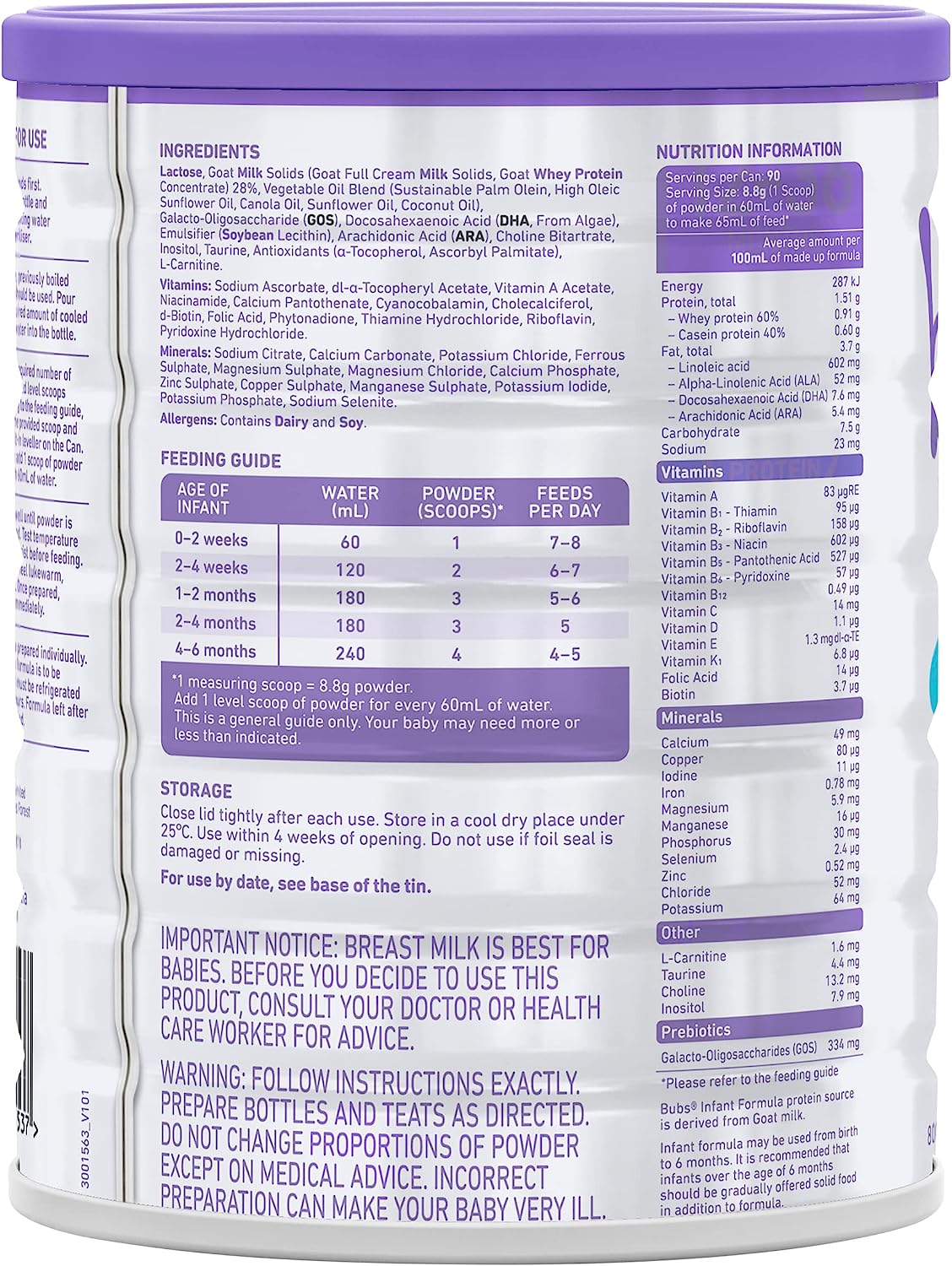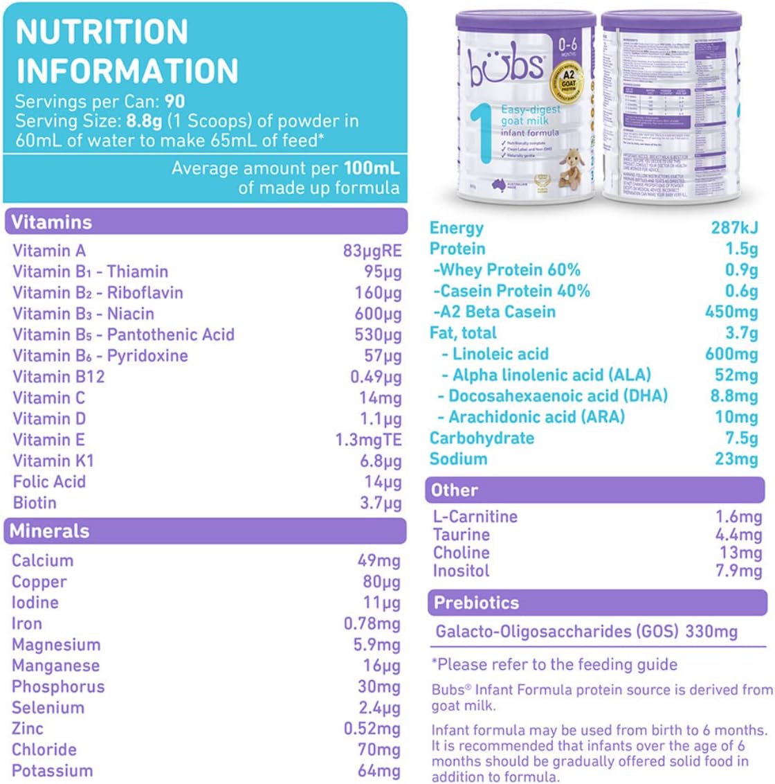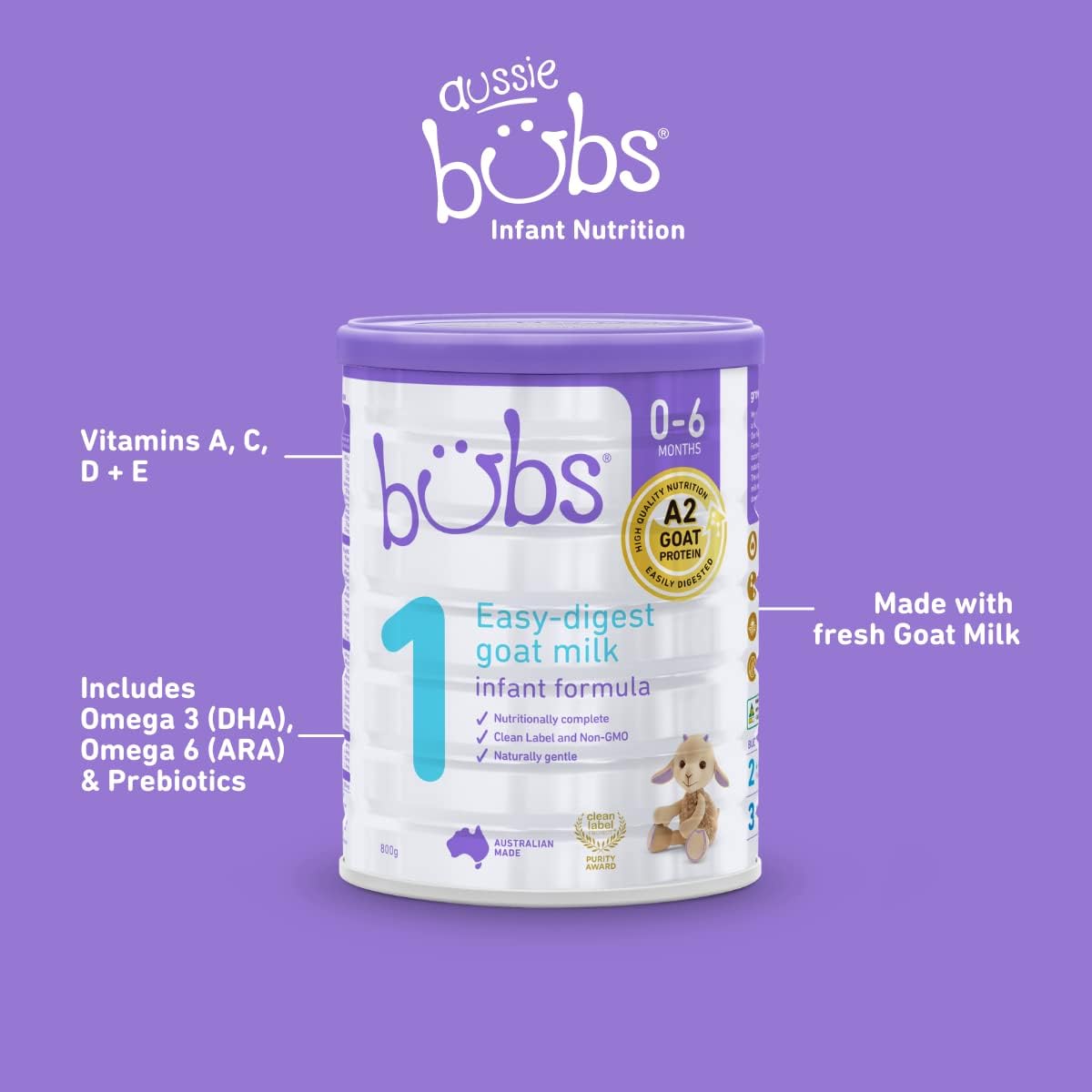 About this item            NATURALLY GENTLE: Bub's Goat Milk Infant Formula Stage 1 is an Australian Made baby formula exclusively formulated for sensitive tiny tummies ages 0-6 months feeding up to 8 times per day, all while made to ensure safety, quality, purity, and nutrition   PURE & BALANCED: Our Bubs goat milk is proudly sourced from our high-quality farmers. Naturally containing A2 Goat Protein, the unique structure of the proteins and fats found makes it easier for little bodies to break down and digest  GOODNESS FROM THE FARM: Bubs Easy-digest goat milk Infant Formula Stage 1 is suitable for sensitive tummies, securely formulated non-GMO, with no artificial colors, flavors, or preservatives, and selected for Clean Label Purity Award  NO HIDDEN NASTIES: Our Bubs Goat Milk Infant Formula gives parents peace of mind and babies a happy start to their life, with A2 Goat Protein, Omega 3, plus Prebiotics, and may be a good alternative for formula fed babies with sensitive tummies  TRUSTED FOR OVER 17 YEARS: Founder Kristy Carr, a mom of three, has a mission to inspire the next generation of happy babies, with Clean Label nutritional products that provide the foundation for setting up a lifetime of good eating habits