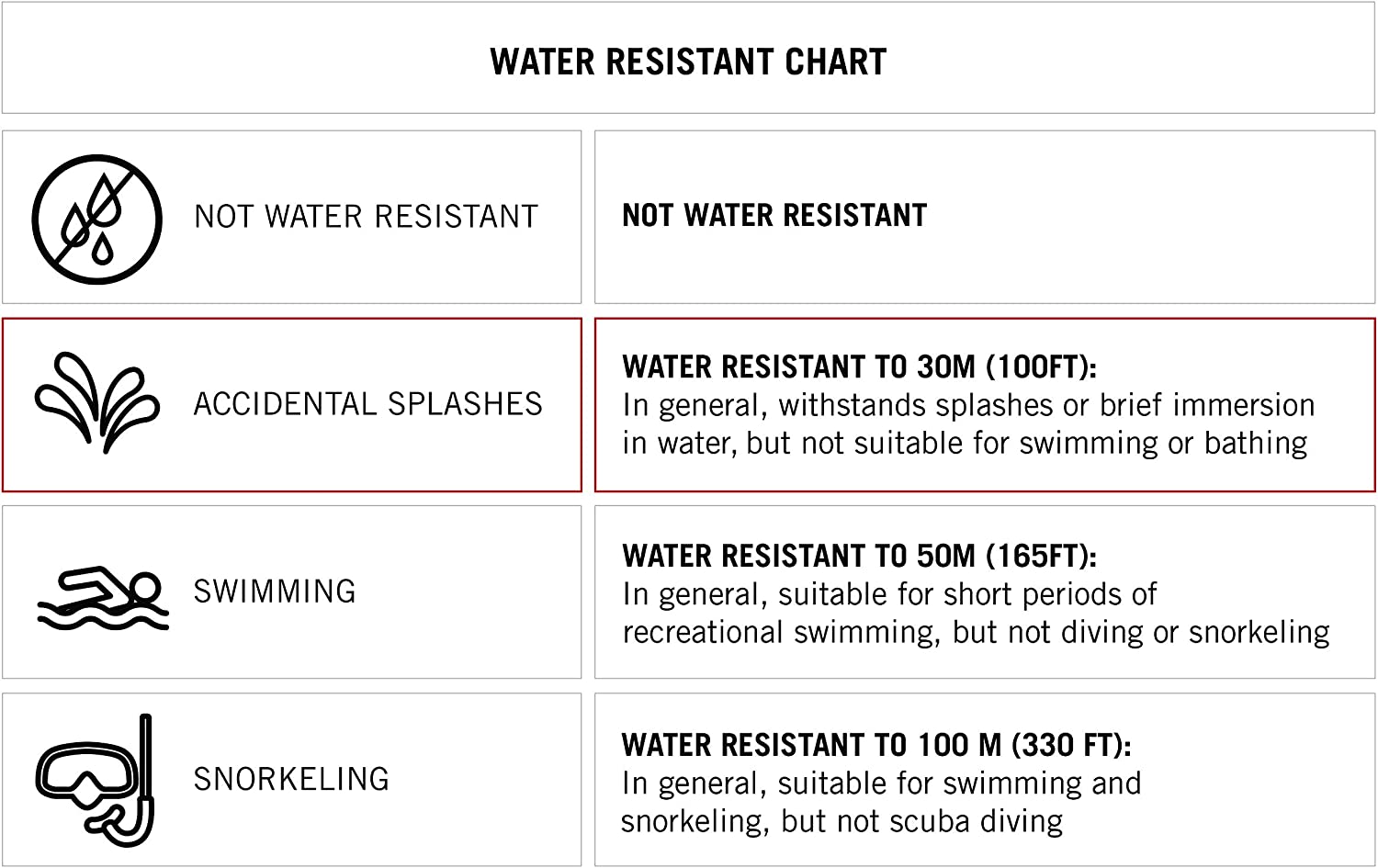 • Water resistant to 30 meter (100 feet): In general, withstands splashes or brief immersion in water, but not suitable for swimming or bathing