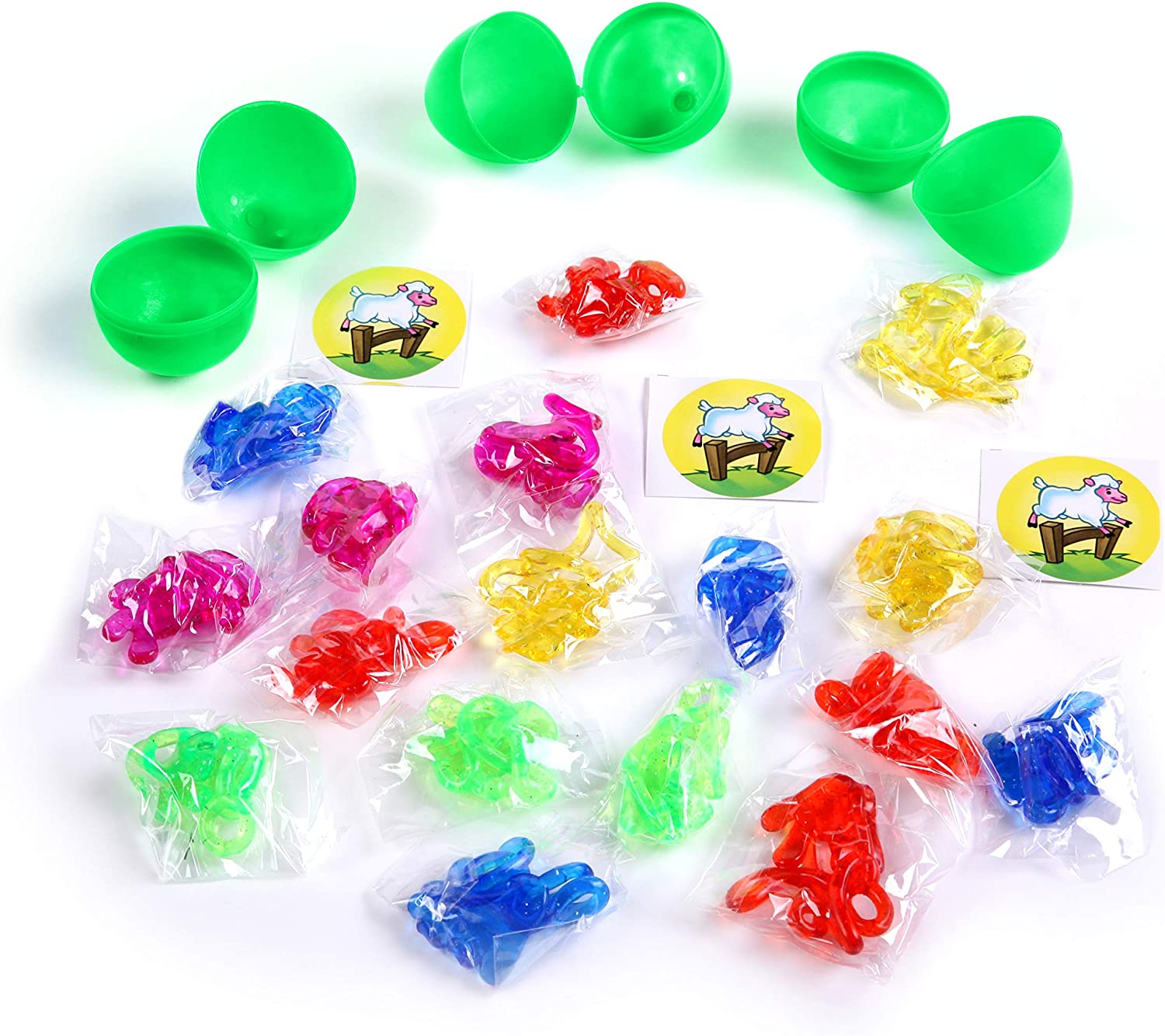 • ?WHAT YOU GET : 100 pre-filled easter eggs with toys inside for kids, all containing a variety of toys such as slap bracelets, sticky hands, light-up rings, key chains etc. These prefilled easter eggs have a tight-fitting top & bottom that keep the toys inside hidden until the child opens the large easter eggs plastic fillable. This jumbo easter eggs plastic fillable set provides children with a delightful & exciting experience as they discover new items from them.