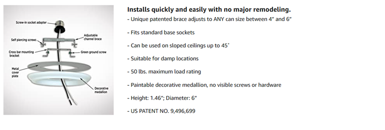 This unique patent-pending Westinghouse Recessed Light Converter offers an easy way to transform your existing recessed lighting into a pendant or light fixture with no major remodeling. Let your creativity inspire you to update your home lighting with this quick and easy upgrade. Hang any pendant or other light fixture of 50 pounds or less where recessed lighting is currently used in your home.The Recessed Light Converter adjusts to any can size between 4-inch and 6-inch, there are no visible screws or hardware and the decorative medallion can be painted to match any decor. This converter works with existing recessed cans that use medium base PAR16, R16, A19, R20, PAR20, BR25, BR30, R30, PAR30, BR38, PAR38, BR40 or R40 light bulbs and is suitable for damp locations.Perfect for kitchens, family rooms or anywhere recessed lighting is used. It includes a versatile white decorative medallion, adjustable bar, socket adapter and mounting hardware for convenient installation.This Westinghouse Recessed Light Converter is CETL listed for safety.Product reference number 01011.