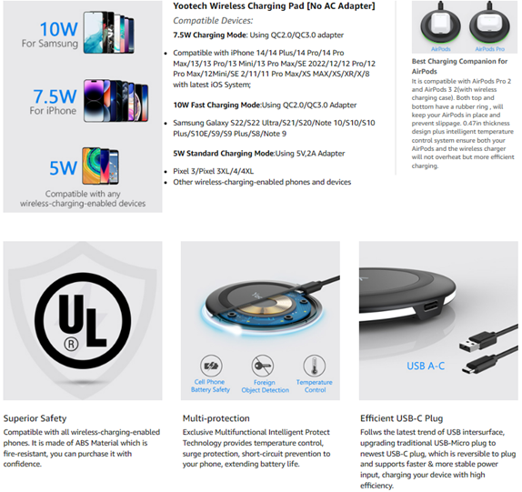 - 【PACKAGE & SERVICE】You will get 1 x Wireless Charging Pad, 1 x 3. 3ft USB Type C Cable, 1 x User Manner and reliable 12-hour response service. At Yootech, zero risk purchase is for every customer's smiles.