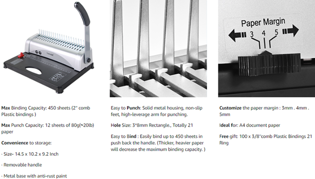 • 【Great Value for Money】: Our binding machine comes with 100pcs of 3/8'' 21-ring black PVC comb spines starter kit, no need to buy separately, save your money. Solid metal housing, non-slip feet, high-leverage arm for punching. Manually punches up to 12 sheets of 80g(paper thickness≈20lb) paper at a time, binds up to 450 sheets. (2'' comb plastic bindings)
