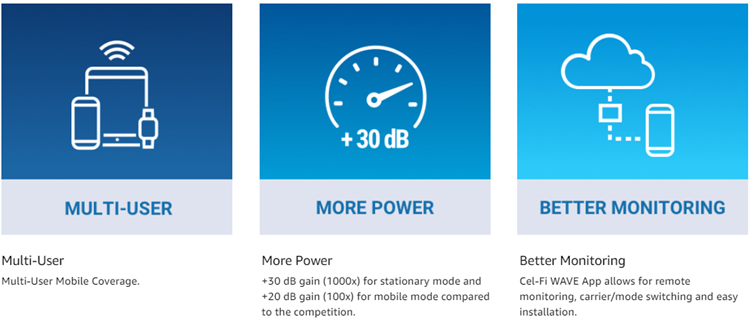 • THE CEL-FI SOLUTION: The Cel-Fi GO Vehicle cellular signal booster gets the best possible signal for YOU because it works exclusively with your carrier. The Cel-Fi GO Vehicle singles out your carrier’s bands for the biggest gain and ensures that your signal isn’t held up in the traffic of other carriers. If you switch providers, you can update your preferences in a flash with the Cel-Fi WAVE app.