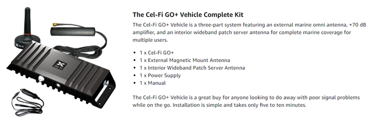 The Cel-Fi GO+ Vehicle is the most powerful multi-user cell phone signal booster for boats and marine vehicles with +70dB gain! Compatible 4G LTE & 3G Networks: AT&T, Verizon 4G, T-Mobile, Sprint and US Cellular. It features the IntelliBoost technology which allows it to automatically adjust to the fast changing cellular network conditions as you move.