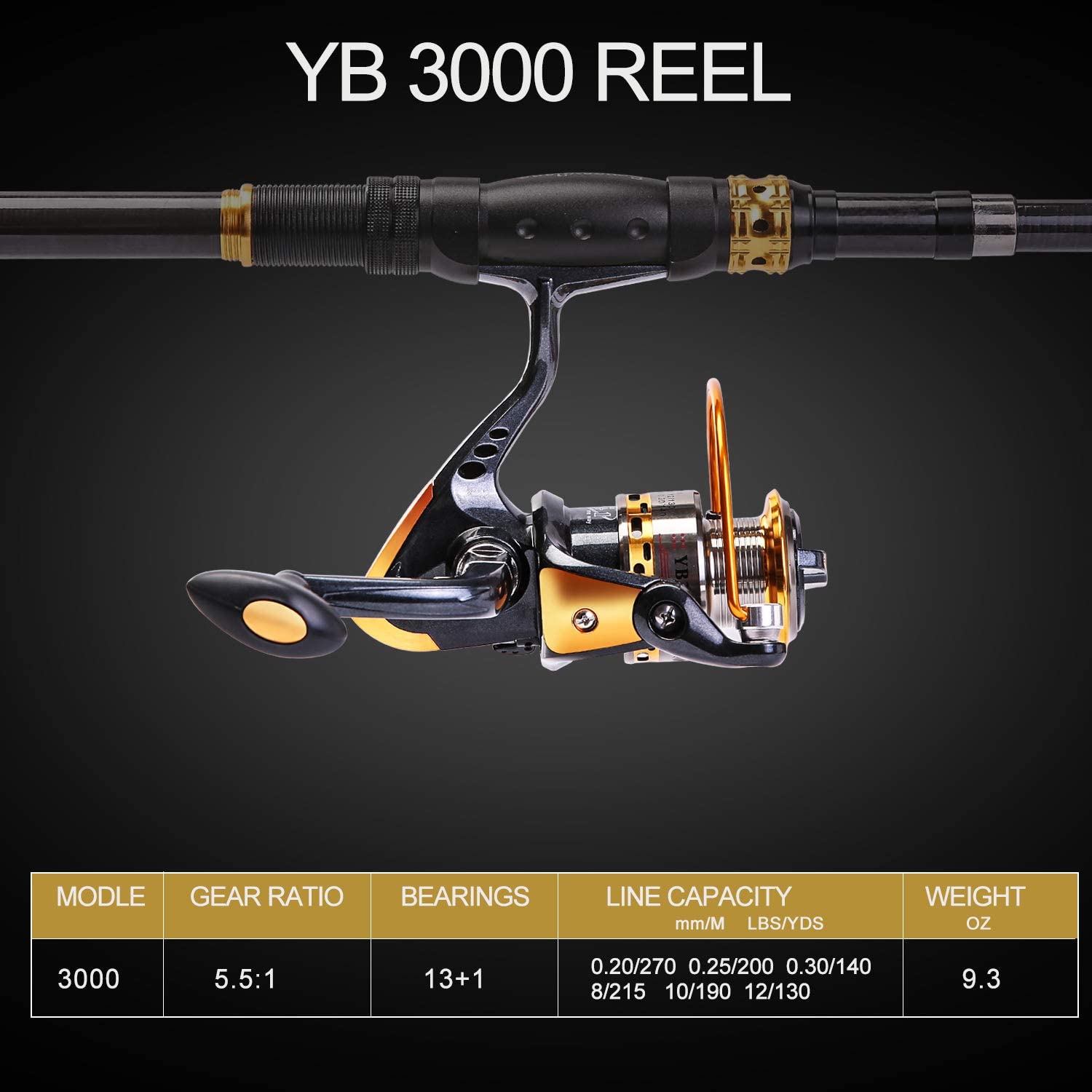 • The Reel- Sougayilang YB Fishing Reel with Left / Right Interchangeable Handle and instant lock anti-reverse,. 13 + 1 high quality stainless steel ball bearings, Gear Ratio 5.5:1. Excellent Line Lay Oscillation System. Model:YB3000.Line capacity: LBS/YDS 8/215 10/190 12/130