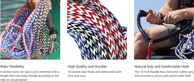 Performance Water Ski Rope This 75 foot long rope has 4 sections (75',60',50',40') to meet the needs of skiers and riders of all skill levels. The 12" aluminum core handle has a performance Tractor grip and full-length molded finger protectors. You'll love the candy stripe color scheme of the UV-treated 16-strand 1,600 lb. tensile strength rope. A Rope Keeper is included for tangle-free storage.
