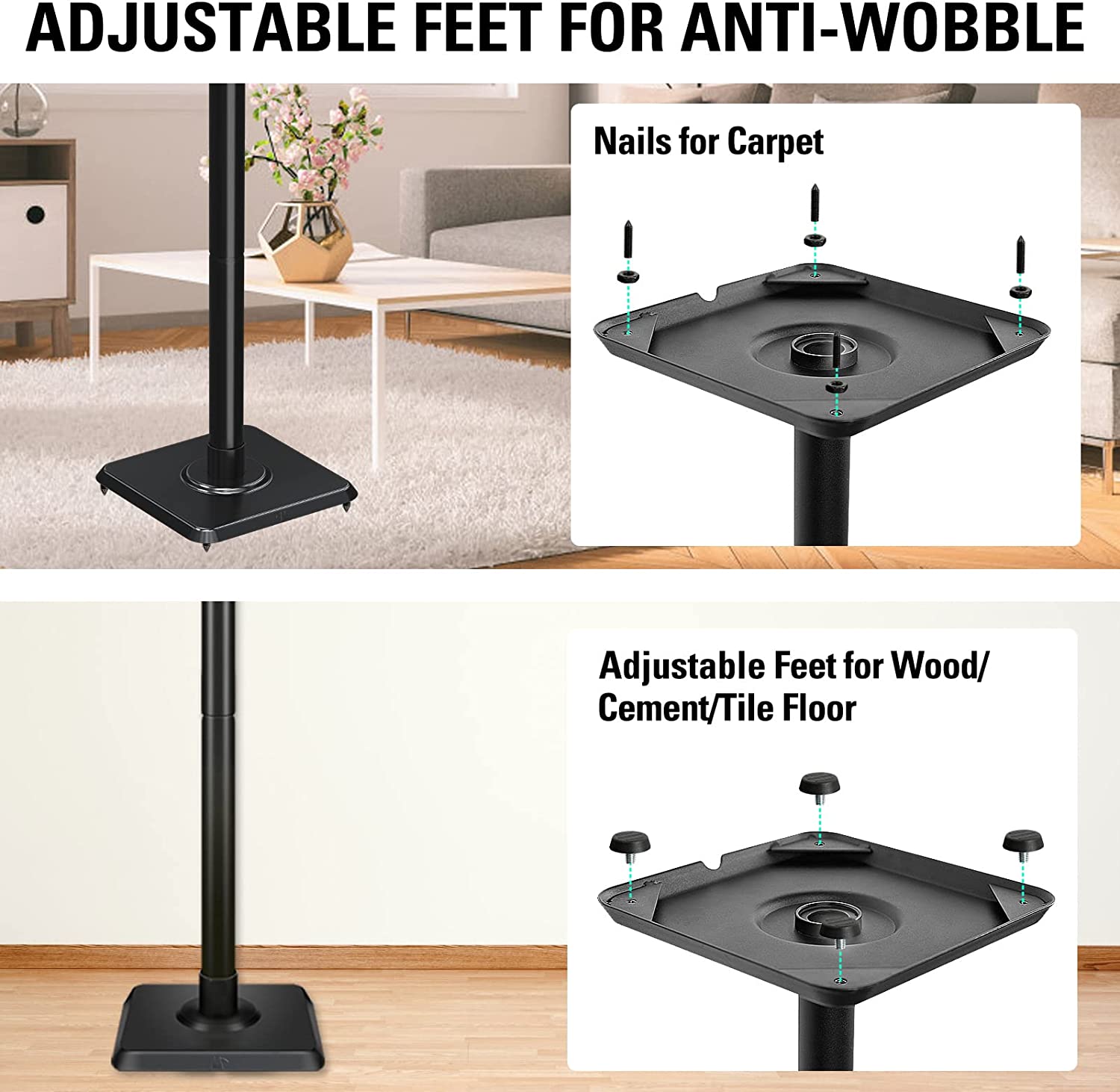 • Come with Carpet Nails - Heavy duty speaker stands hold most speakers up to 11 lbs. Come with adjustable plastic feet and carpet nails for different floor type such as wood, cement, tile floor and carpet. Adjust the feet to level the base for better stability