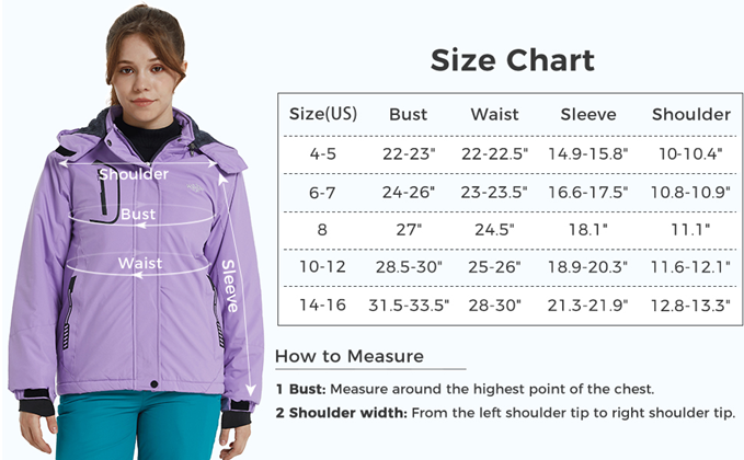 Keep Waterproof but Dry - With a 10000mm waterproof repellent coating, this kid girls' winter coats is great for keeping your child dry during skiing or snowboarding. Plus, the windproof skirt on the girls' skiing jacket works to keep snow, snowflakes, and cold air from getting inside the jacket.