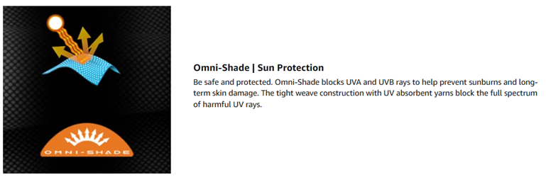 • OMNI-SHADE: Be safe and protected. Omni-Shade blocks UVA and UVB rays to help prevent sunburns and long-term skin damage. The tight weave construction with UV absorbent yarns block the full spectrum of harmful UV rays