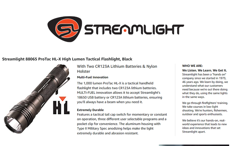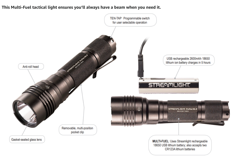 • Multi battery versatility; Streamlight 88064 and 88065 come with CR123A batteries but can use Streamlight's SL-B26 rechargeable system and batteries sold separately