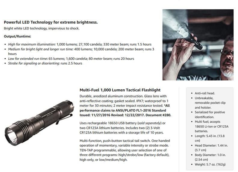 • Tactical tail cap switch for momentary or constant on operation, three different user selectable programs and a pocket clip for convenience