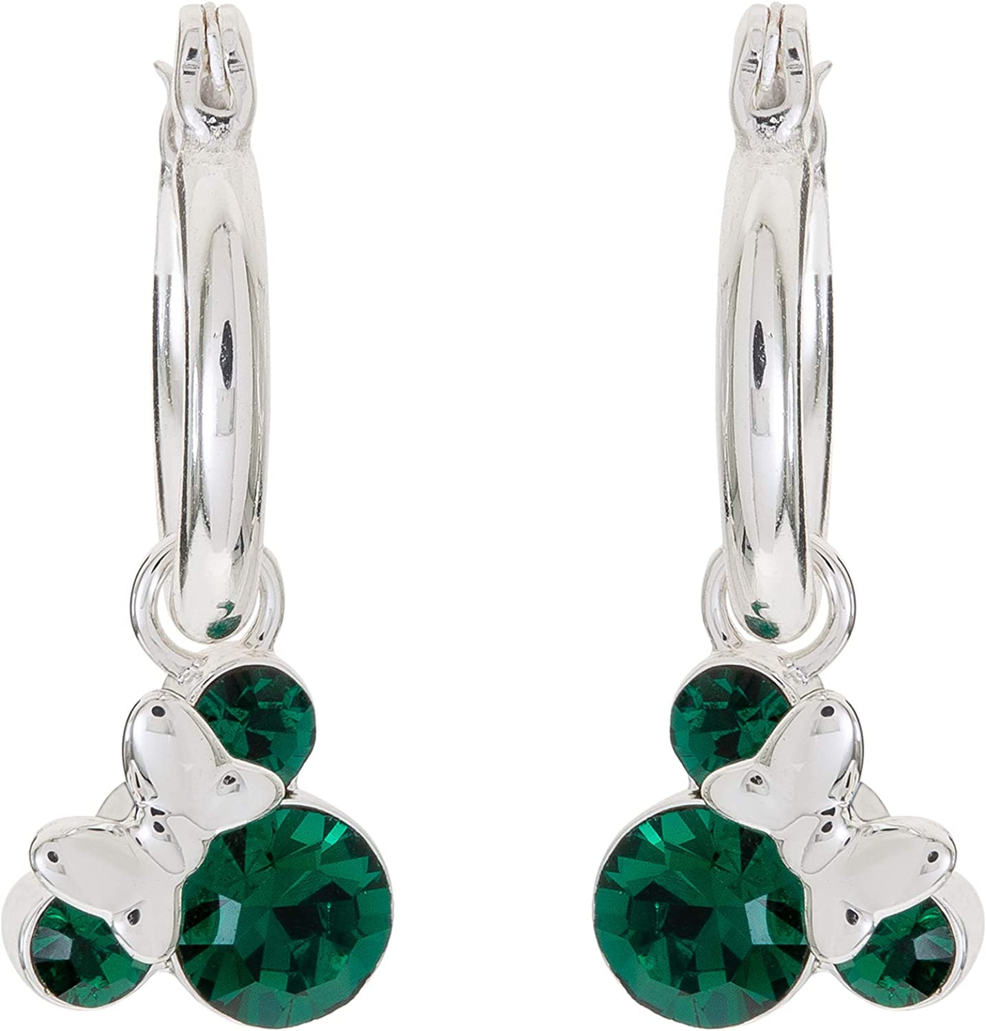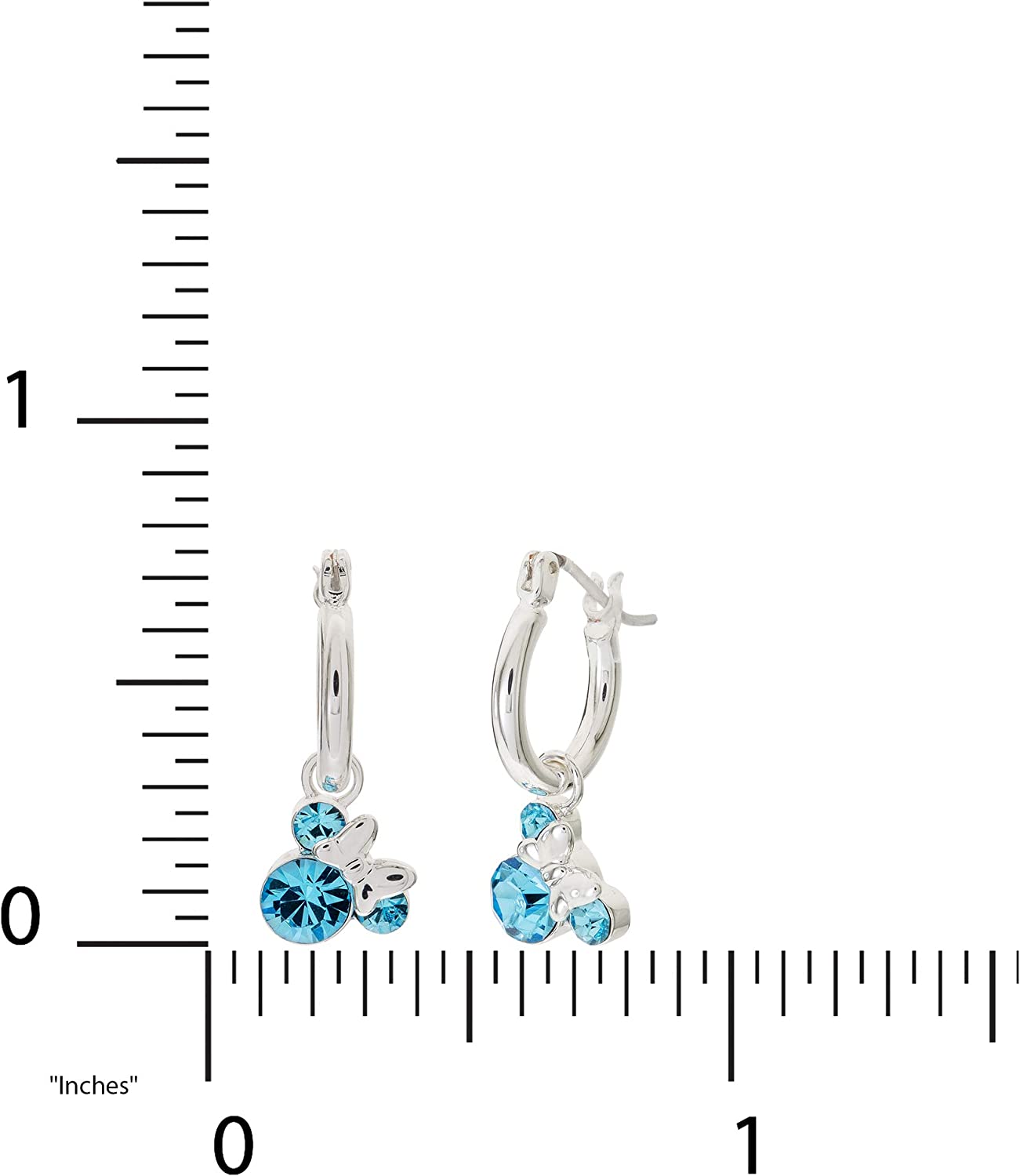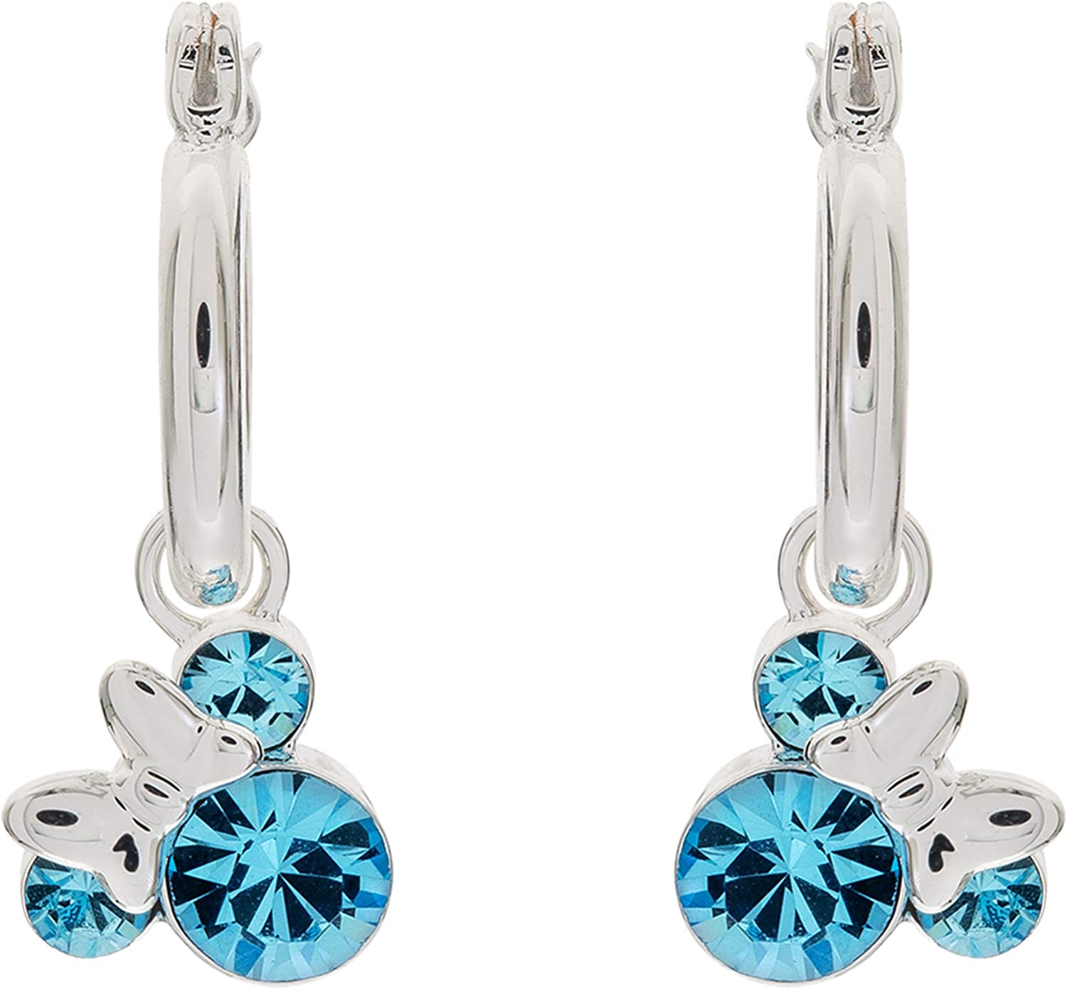 Disney Minnie Mouse Jewelry, Crystal Birthstone Silver Plated Hoop Dangle Earrings, Latch Back