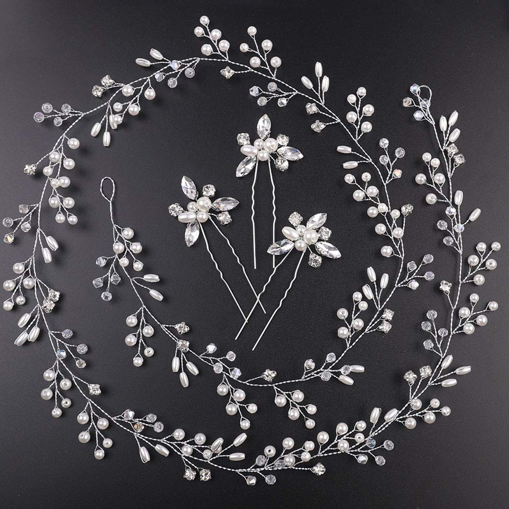 Denifery Bridal Rose Gold and Gold Silver Extra Long Pearl and Crystal Beads Bridal Hair Vine Wedding Head Piece Bridal Hair Accessories Headband Hair Jewelry Hair Accessories (Silver)