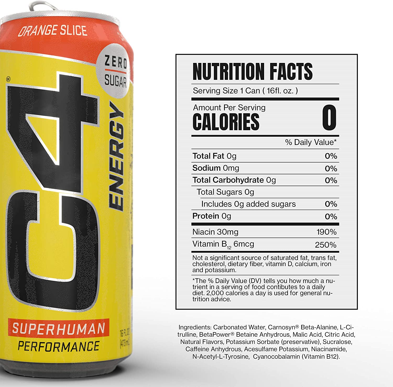 C4 Energy Carbonated Zero Sugar Energy Drink, Pre Workout Drink + Beta Alanine, Orange Slice, 16 Fl Oz (Pack of 12)