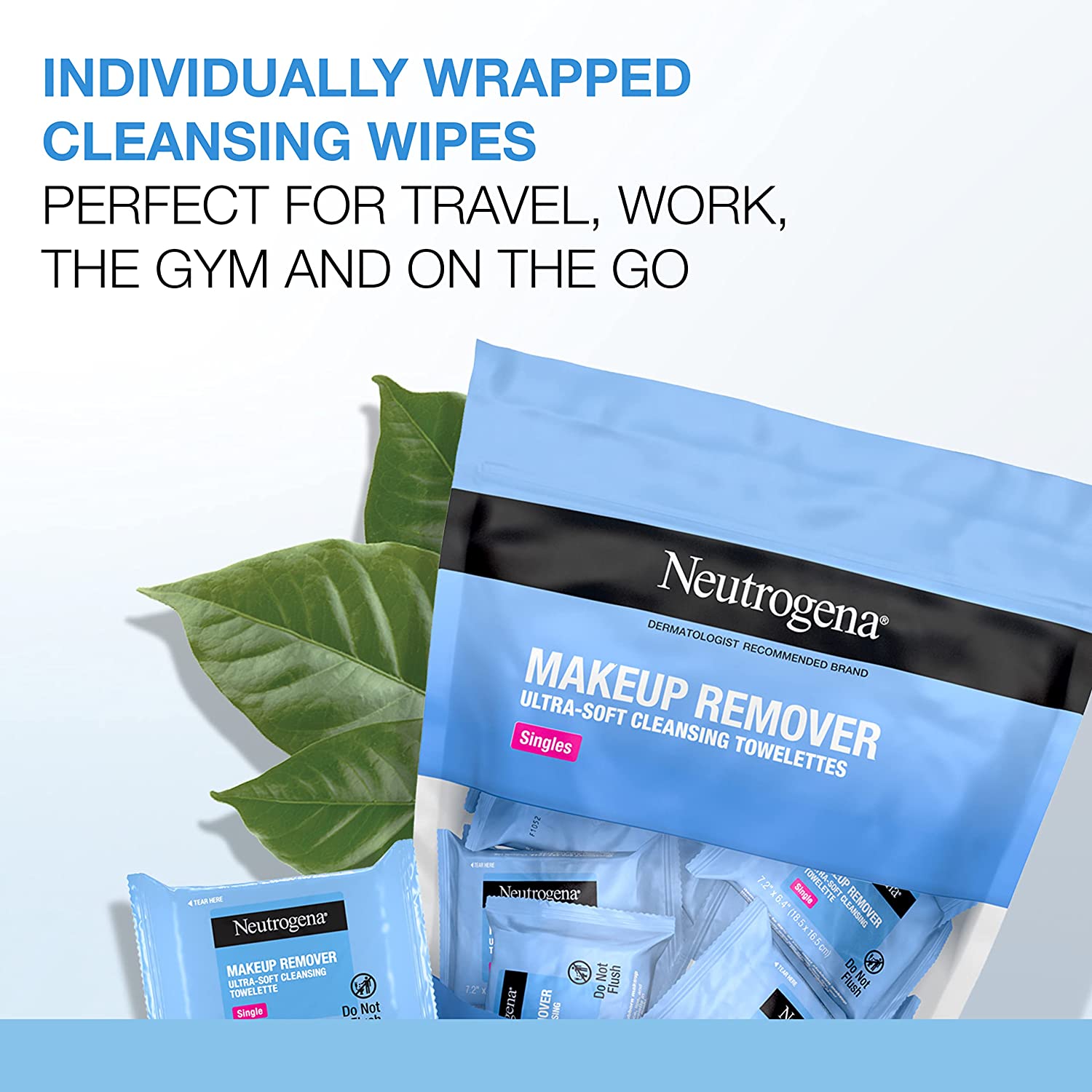 • 20-count of individually wrapped pre-moistened Neutrogena Makeup Remover Face Wipe Singles. Individually wrapped facial cleansing towelettes are protected so you always have a fresh and effective wipe for complete cleansing and makeup removal
