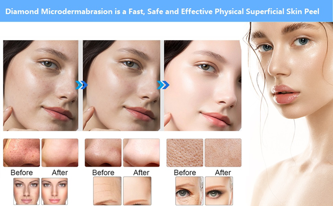 - ?【Diamond Dermabrasion】 It provides skin resurfacing procedure by using sterile diamond heads to peel. And rub off the dead cells at the top skin layer followed by vacuuming/suction removing particles along with any dirt and dead skin