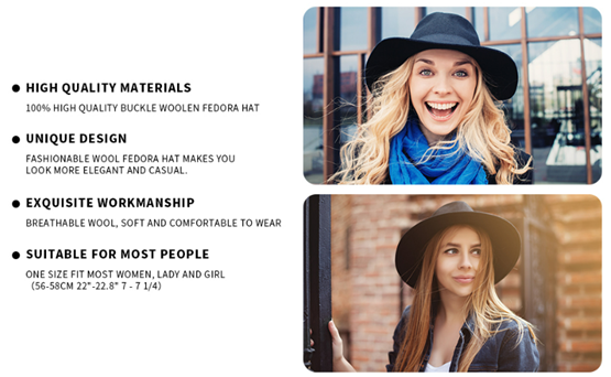 Made from a soft and comfortable blend of 65% polyester and 35% wool, these fedora hats are perfect for any occasion. With a one-size-fits-all design and a hat circumference of 22.6 inches, they are sure to fit most women. Plus, the brim measures 2.9 inches, providing ample shade and protection from the sun.