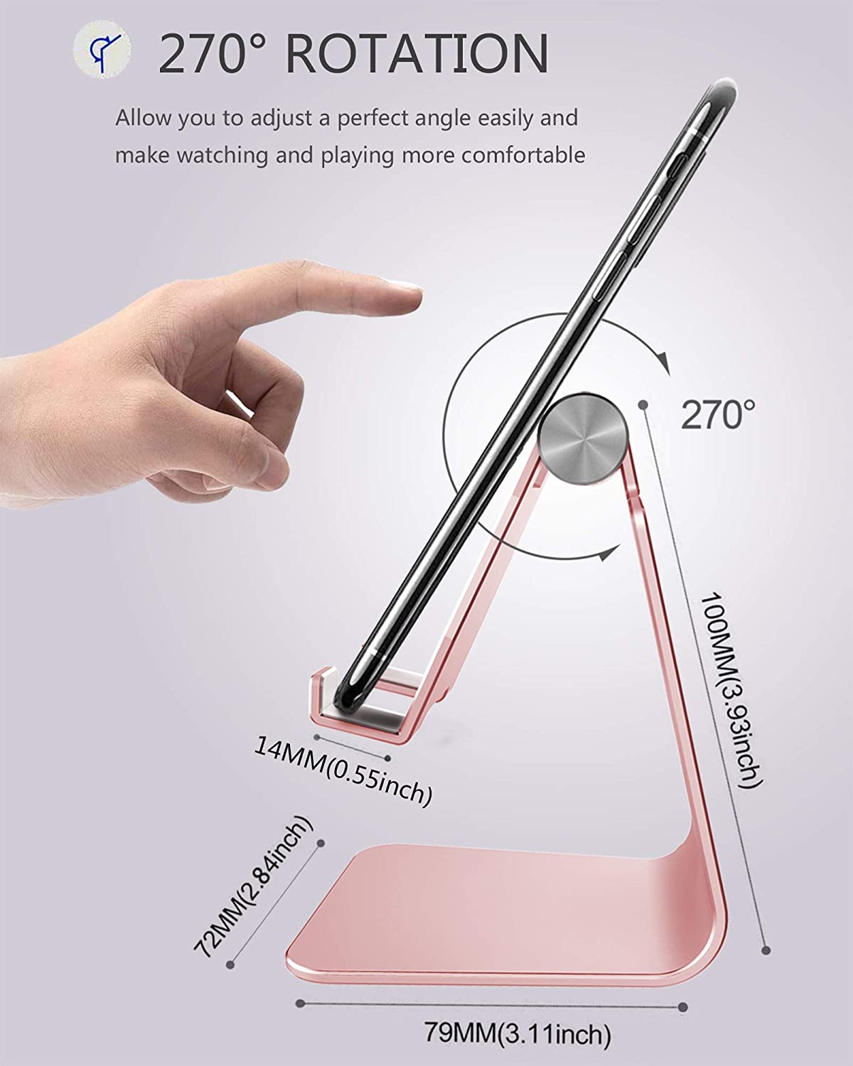 Special Design: MULTI-ANGLE design make cell phone stand possible to be adjusted to your desired angle (270 degree). And compared with other phone stands, the hook of our stands have been widened in order to fit well with the devices in protect case.