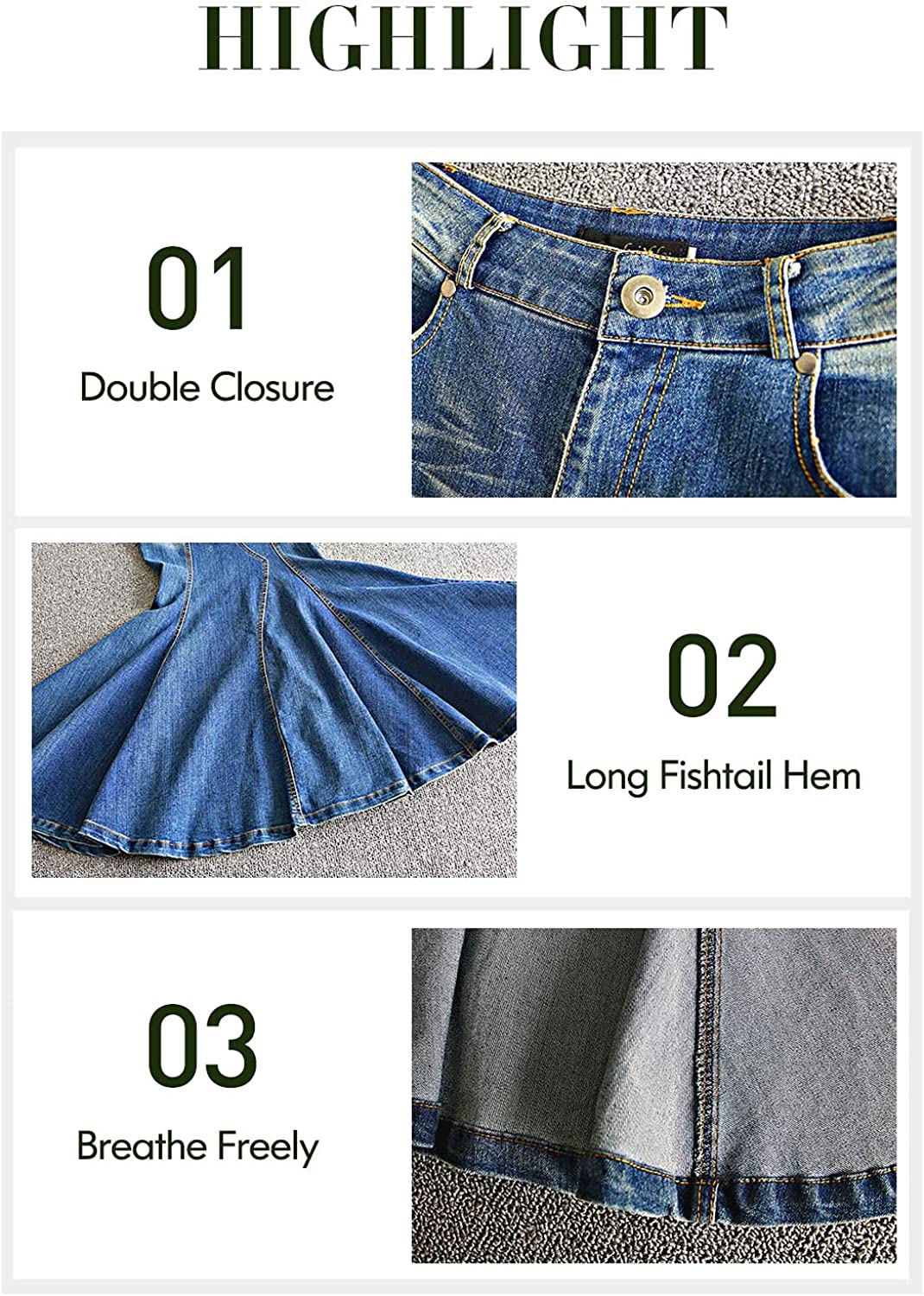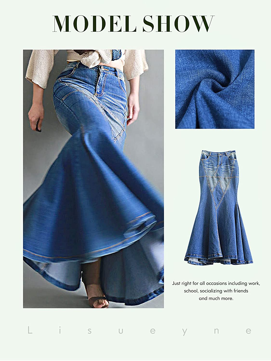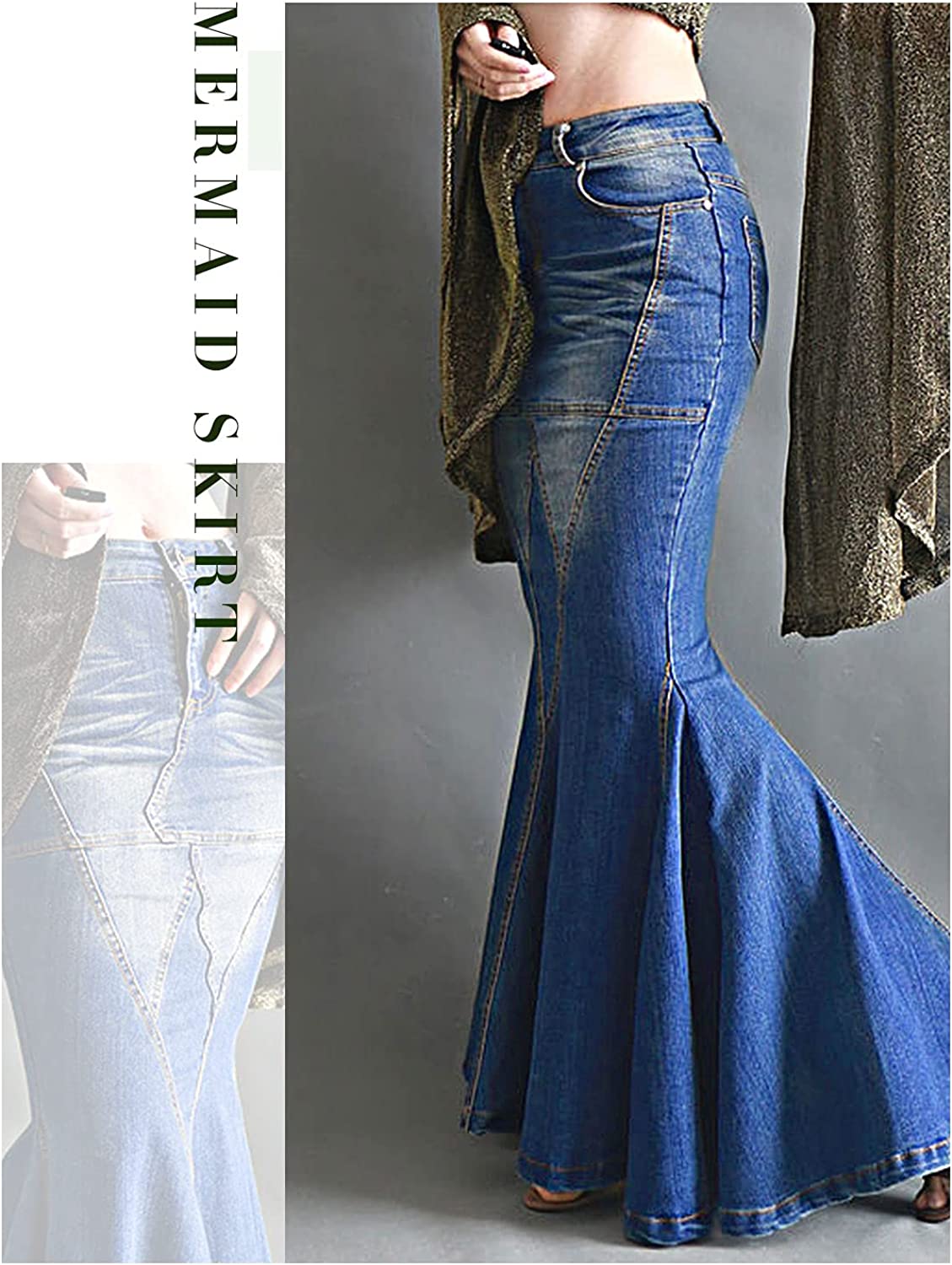 LISUEYNE Women's Casual Stretch Waist Washed Denim Ruffle Fishtail Skirts Long Jean Skirt