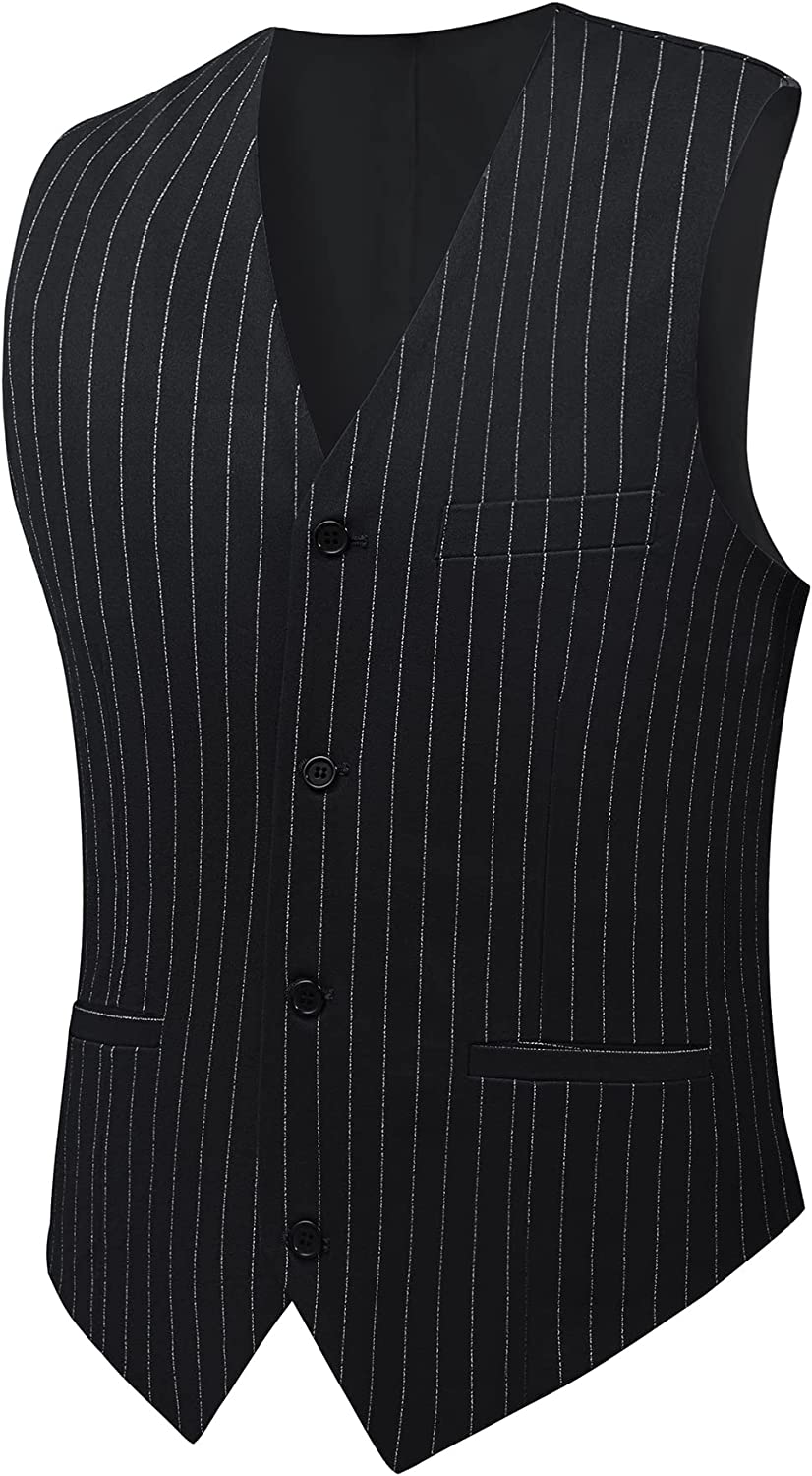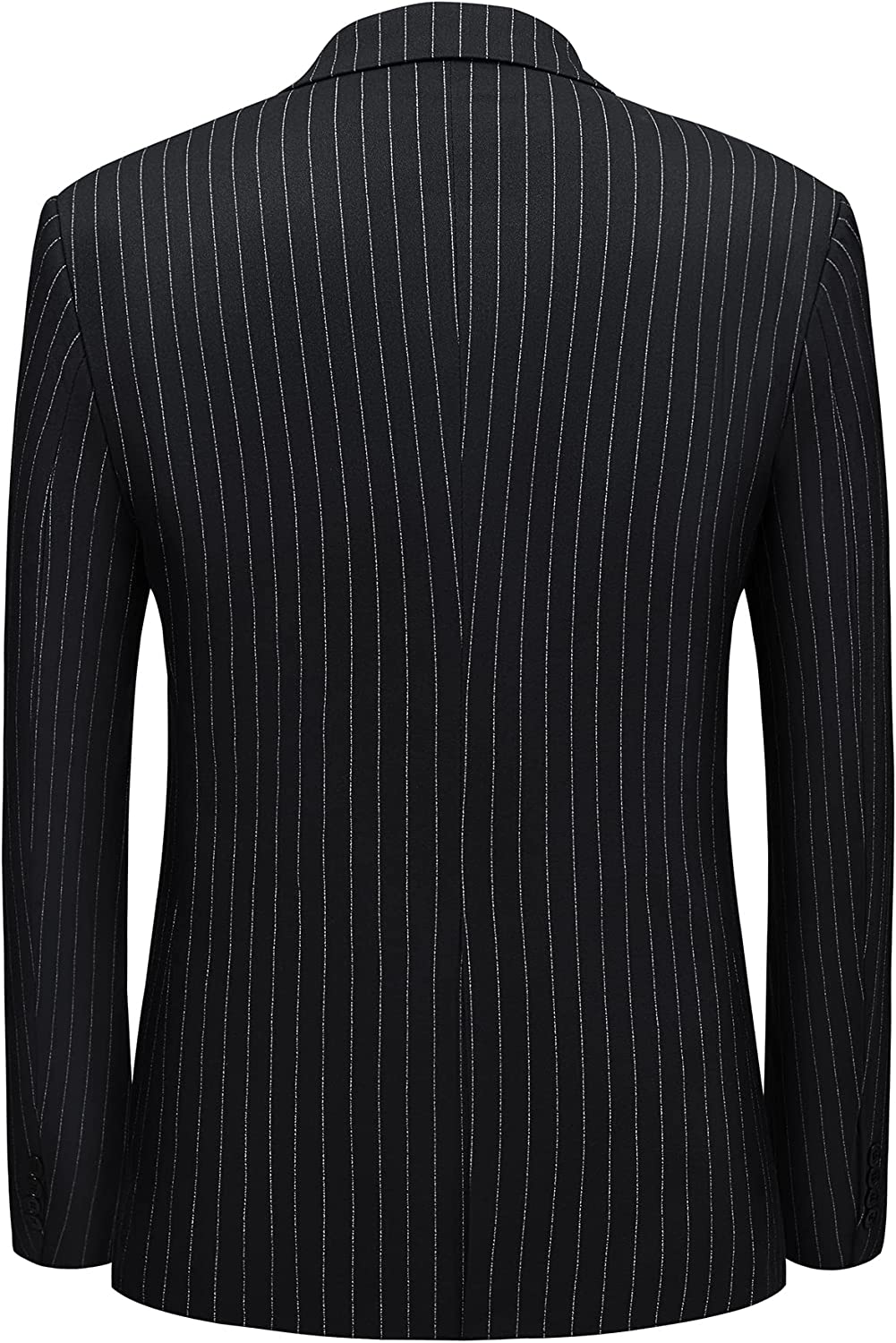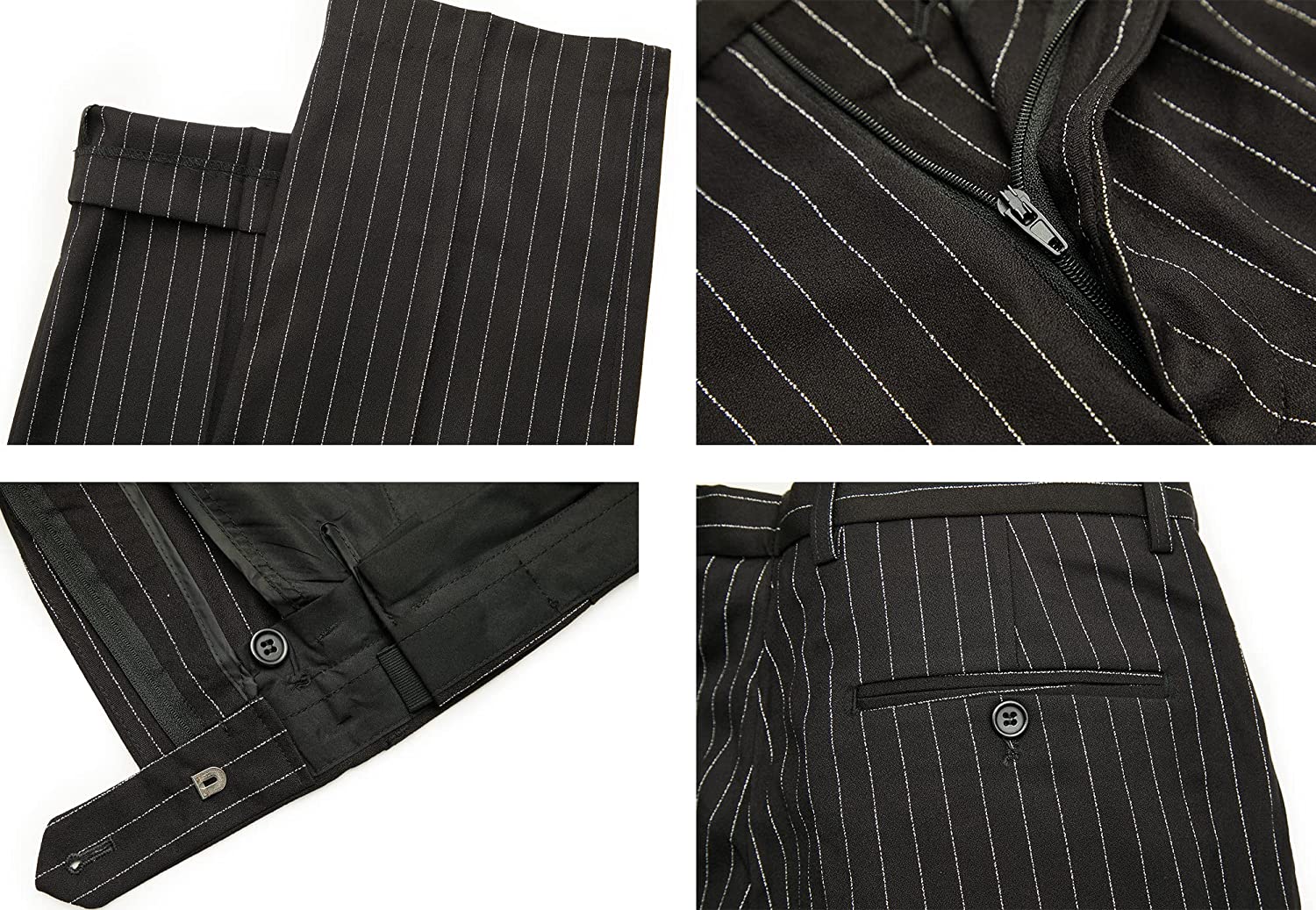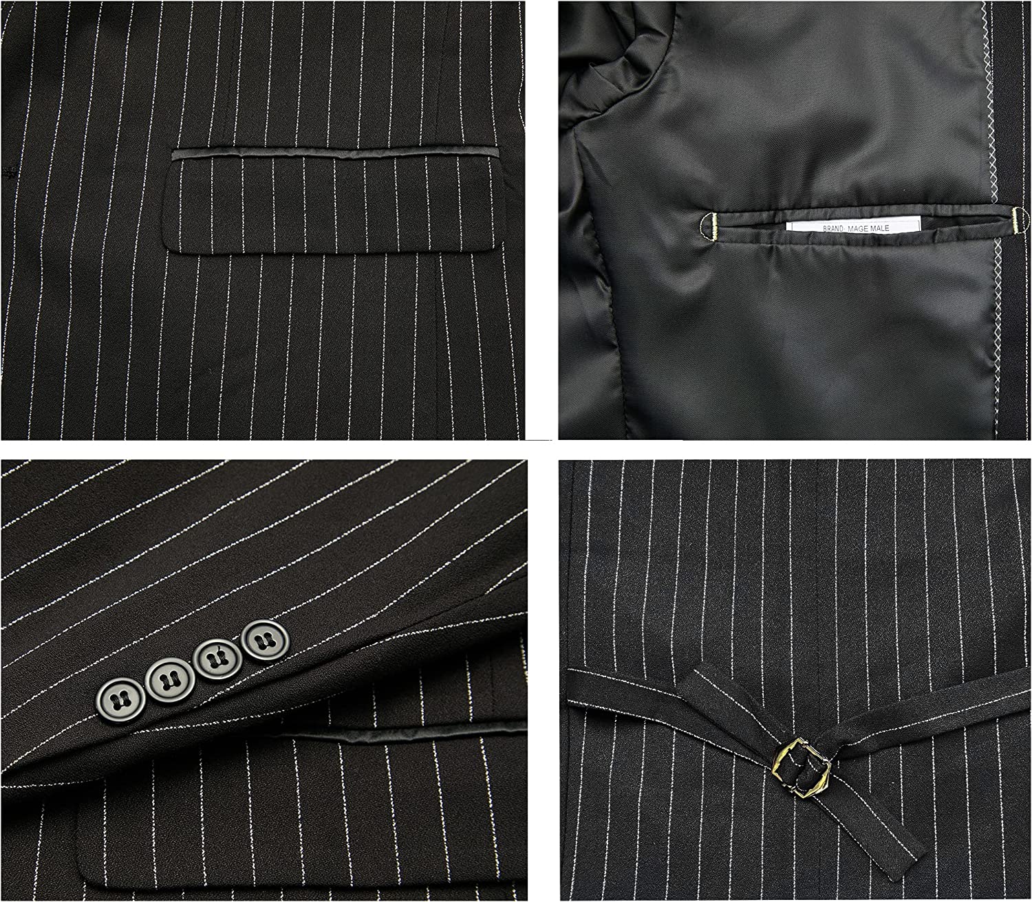• Button Fly closure, slim fit notch lapel flap pocket. Premium center vent two-button single breasted stripe suit jacket with matched four-button vest with back adjustable belt for better fit and classic trousers.