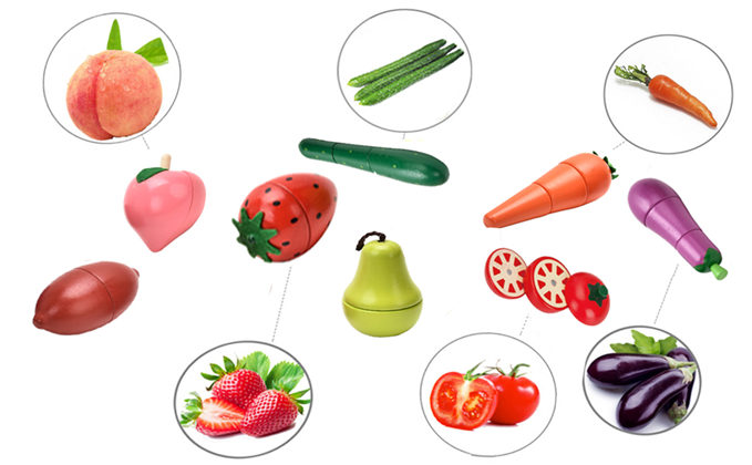 - ENHANCE - Kids can enjoy playing with the bright colored foods, cutting them on the chopping block.Invite early dramatic play,enhance vocabularies and reinforce healthy eating with familiar looking produce.