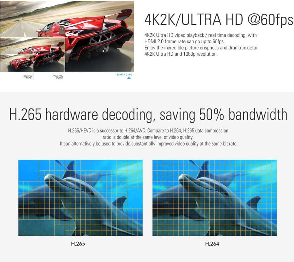 • With 3GB DDR4 RAM, 16GB Memory and a built-in hard drive bay, able to playback 4K@60fps, support Dolby Vision and 10-bit HEVC hardware decoding, enjoy the incredible picture cripness and dramatic detail 4K2K ultra HD and 1080p resolution