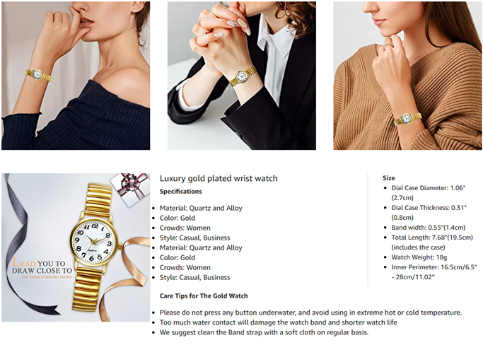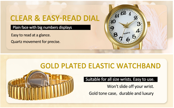 - ?【HIGH QUALITY】Polished Gold-Tone Metal Expansion Band. Stretchable watchband for adjustable size. Easy to put on and take off. Fits wrists size from 17cm-28cm/6.7in-11.02in. Durable premium metal watch case. No more key scratch with the high hardness mineral glass watch face.