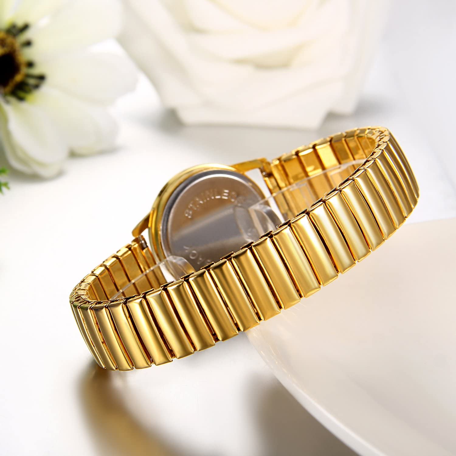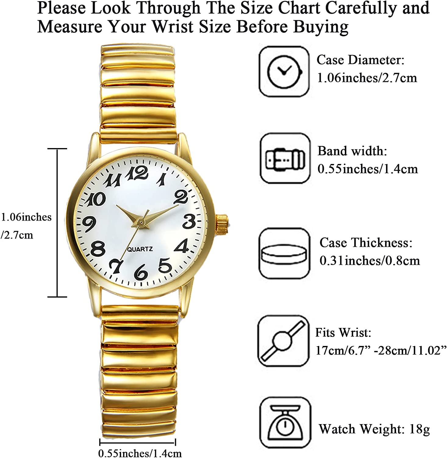 • ?【HIGH QUALITY】Polished Gold-Tone Metal Expansion Band. Stretchable watchband for adjustable size. Easy to put on and take off. Fits wrists size from 17cm-28cm/6.7in-11.02in. Durable premium metal watch case. No more key scratch with the high hardness mineral glass watch face.