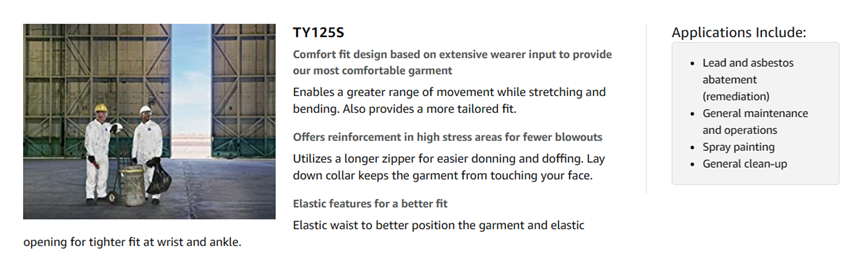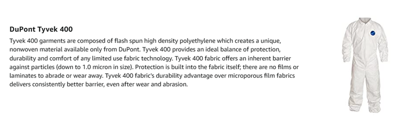 Tyvek garments are composed of flash spun high density polyethylene which creates a unique, nonwoven material available only from DuPont. Tyvek provides an ideal balance of protection, durability and comfort of any limited use fabric technology. Tyvek fabric offers an inherent barrier to small size particles. Protection is built into the fabric itself; there are no films or laminates to abrade or wear away. Tyvek fabric's durability advantage over microporous film fabrics delivers consistently better barrier, even after wear and abrasion. Applications include: lead and asbestos abatement/remedation, general maintenance/operations, spray painting, general clean-up.
