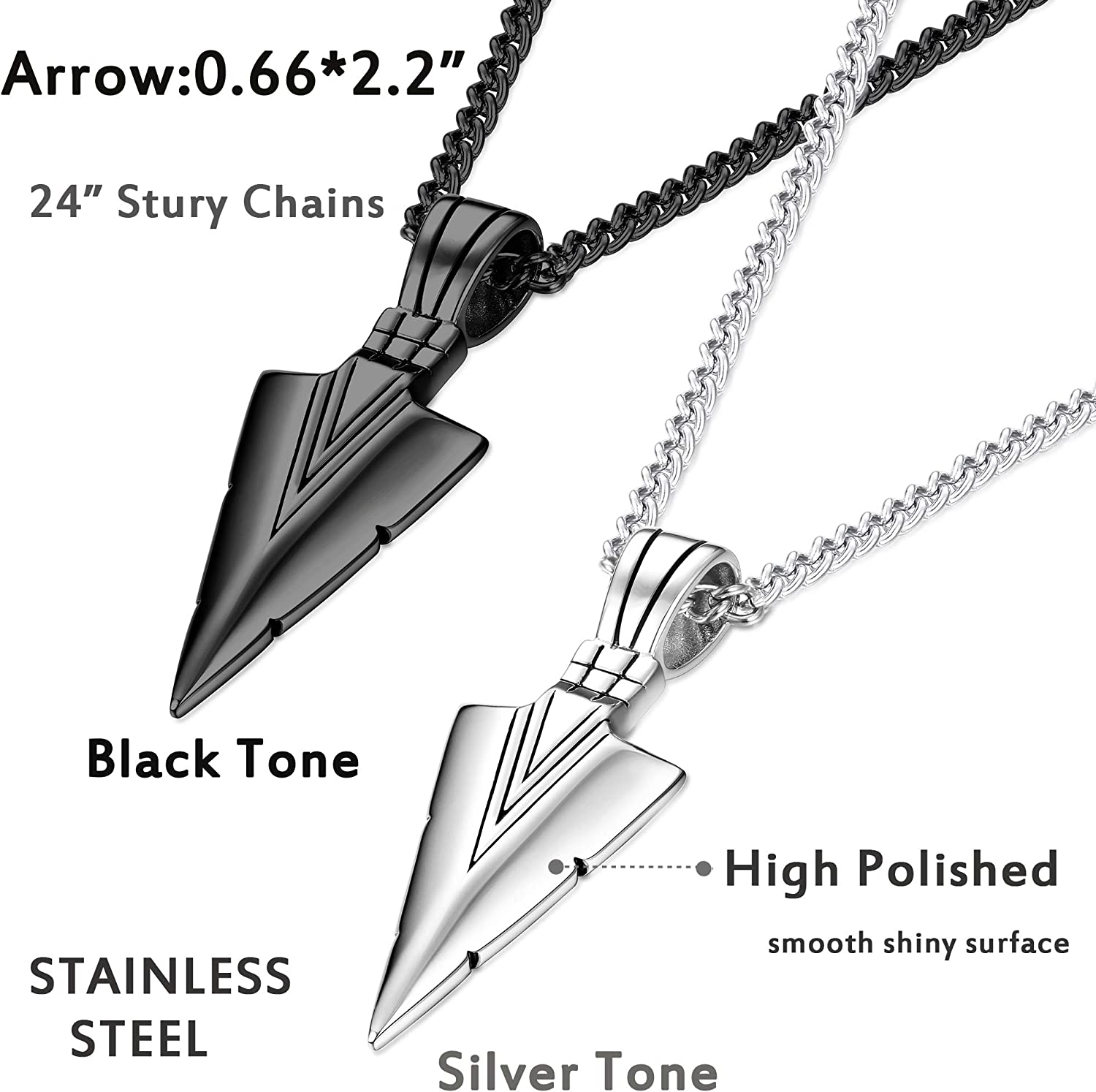• NECKLACE DIMENSION-- 2Pcs Necklace Are In Same Size, Arrowhead Pendant: 0.66*2.2"(17mm*56mm), Come With 2Pcs 24Inches Sturdy Curb Chains, Best Length As Necklace; Color: Silver Tone/Black Tone; Good Weight To Hang On Your Neck, Definitely Would Be Nice For Anyone!