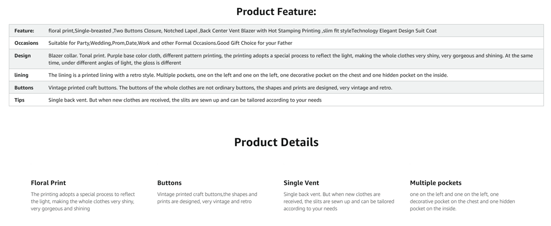 Feature:Single-breasted Suit Jacket Two Buttons Closure Notched Lapel Back Center Vent Blazer with Hot Stamping Printing Technology