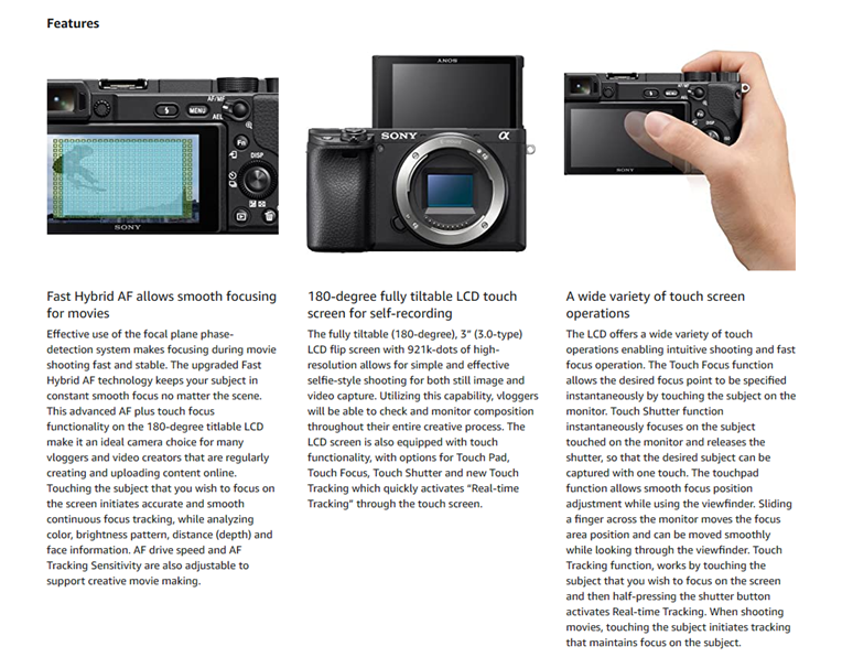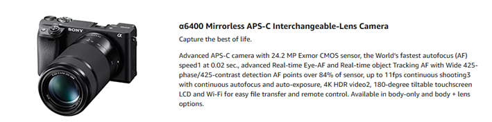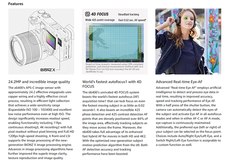 Sony Alpha a6400 Mirrorless Camera: Compact APS-C Interchangeable Lens Digital Camera with Real-Time Eye Auto Focus, 4K Video, Flip Screen & 18-135mm Lens - E Mount Compatible Cameras - ILCE-6400M/B