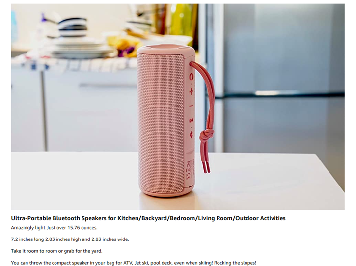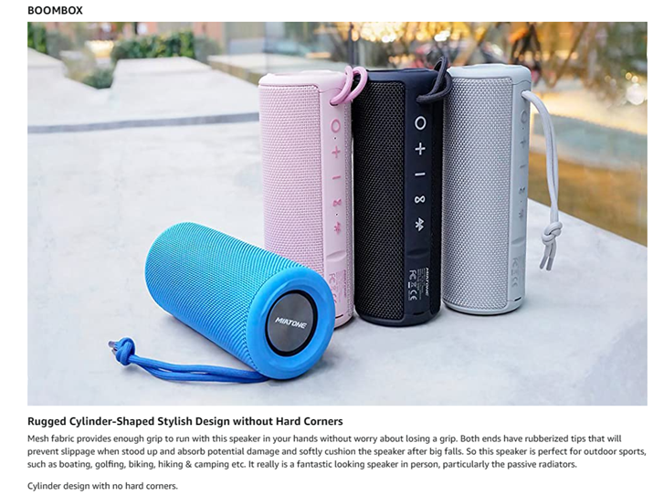 - [Rugged Cylinder - Shaped Housing] Mesh fabric provides enough grip to run with this portable speaker in your hands without worry about losing a grip. Both ends have rubberized tips that will prevent slippage when stood up and absorb potential damage and softly cushion the speaker after big falls. So this speaker is perfect for outdoor sports, such as skiing, golfing, biking, hiking & camping etc.