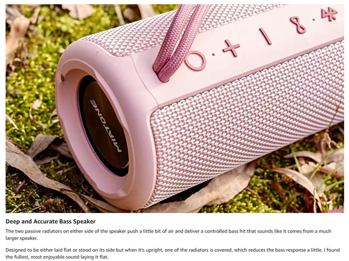 - [Immersive Sound] Featuring MIATONE unique audio processing, the sound quality of BOOMBOX bluetooth speaker is significantly better across the entire frequency range from dual precision acoustic stereo drivers. It handles crisp treble and mid frequencies excellently without noticeable crackle at max volume. Using DSP technology, dual advanced subwoofers and aluminum passive radiators on each ends boost deep and accurate bass that's true to your music. No exaggeration and distortion.